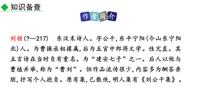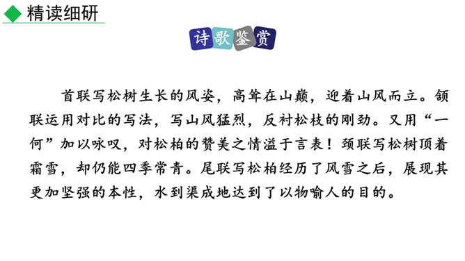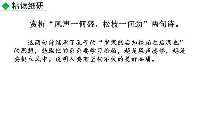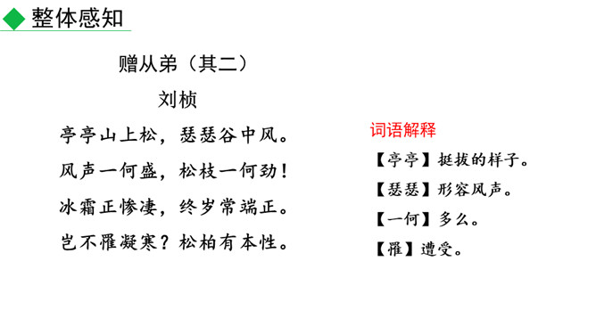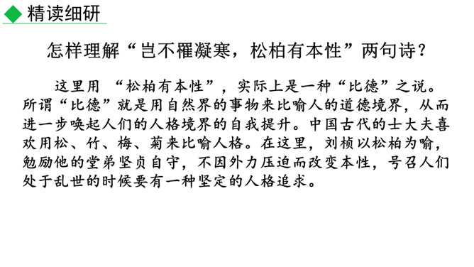 赏析“风声一何盛,松枝一何劲”两句诗。这两句诗继承了孔子的“岁寒然后知松柏之后凋也”的思想,勉励他的弟弟要学习松柏,越是风声凄惨,越是要挺立风中。说明人要有坚韧不拔的美好品质。怎样理解“岂不罹凝寒,松柏有本性”两句诗?这里用 “松柏有本性”,实际上是一种“比德”之说。所谓“比德”就是用自然界的事物来比喻人的道德境界,从而进一步唤起人们的人格境界的自我提升。中国古代的士大夫喜欢用松、竹、梅、菊来比喻人格。在这里,刘桢以松柏为喻,勉励他的堂弟坚贞自守。所属专题:赠从弟ppt。