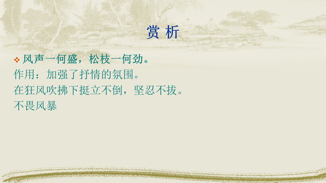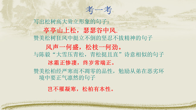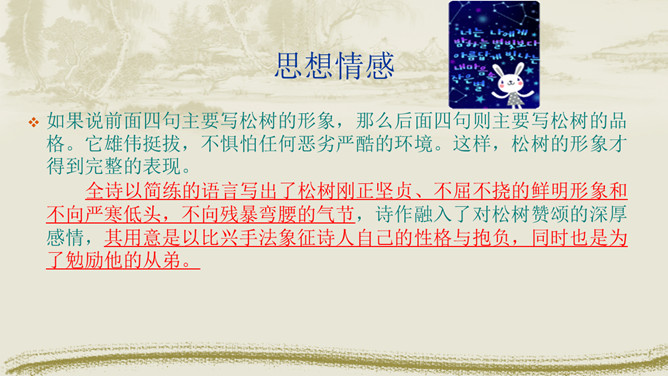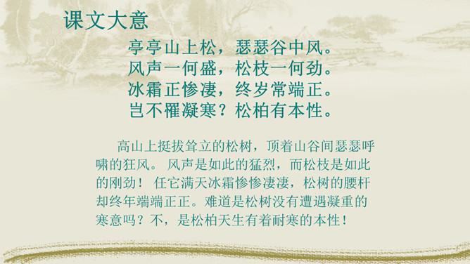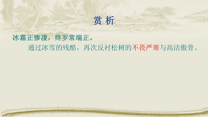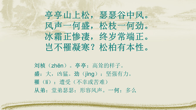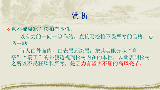 以有力的一问一答作结。直接写松柏不畏严寒的品格,点名主题。诗人由外而内,由表层到深层,把读者眼光从“亭亭”“端正”的外貌透视到松树内在的本性,以此表明松树之所以不畏狂风和严寒,是因为有坚贞不屈的高风亮节。如果说前面四句主要写松树的形象,那么后面四句则主要写松树的品格。它雄伟挺拔,不惧怕任何恶劣严酷的环境。这样,松树的形象才得到完整的表现。全诗以简练的语言写出了松树刚正坚贞、不屈不挠的鲜明形象和不向严寒低头,不向残暴弯腰的气节,诗作融入了对松树赞颂的深厚感情。所属专题:赠从弟ppt。