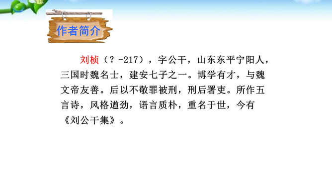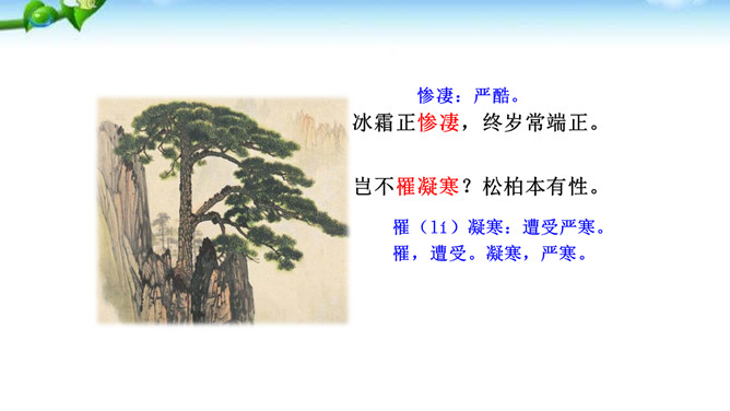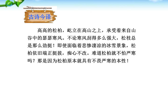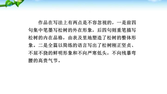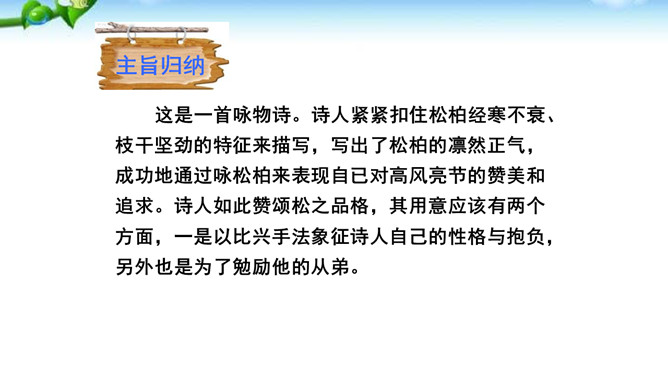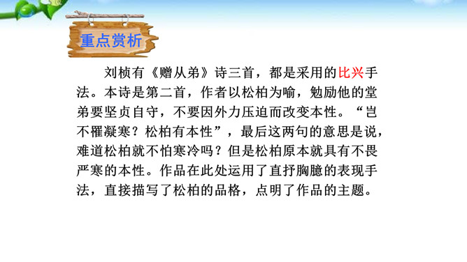 这是一首咏物诗。诗人紧紧扣住松柏经寒不衰、枝干坚劲的特征来描写,写出了松柏的凛然正气,成功地通过咏松柏来表现自已对高风亮节的赞美和追求。诗人如此赞颂松之品格,其用意应该有两个方面,一是以比兴手法象征诗人自己的性格与抱负,另外也是为了勉励他的从弟。作品在写法上有两点是不容忽视的,一是前四句集中笔墨写松树的外在形象,后四句则重笔描写松树的内在品格,由表及里地塑造了松树的整体形象。二是全篇以简练的语言写出了松树刚正坚贞、不屈不挠的鲜明形象和不向严寒低头,不向残暴弯腰的高贵气节。所属专题:赠从弟ppt。