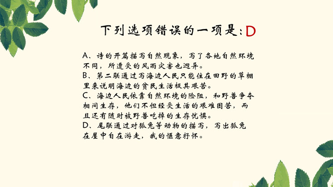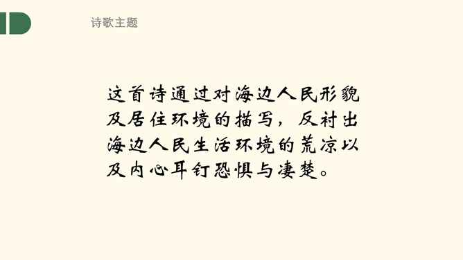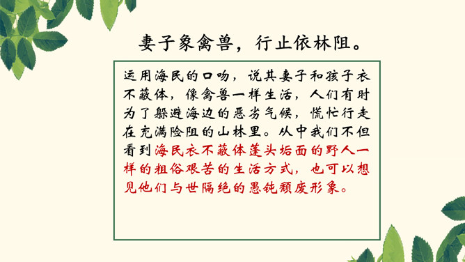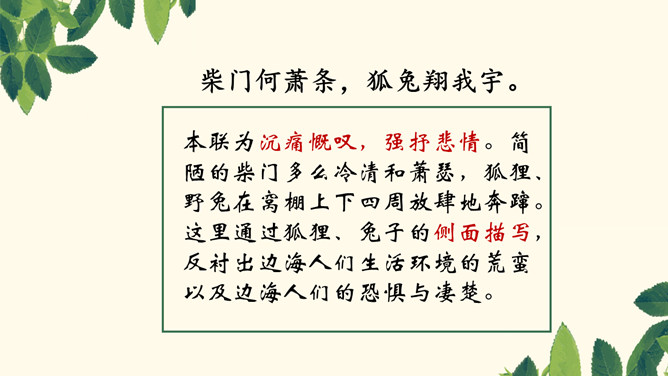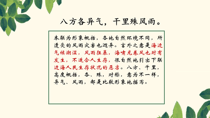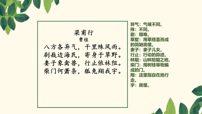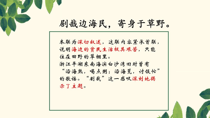 本联为形象概括,各地自然环境不同,所遭受的风雨灾害也迥异。言外之意是海边气候潮湿,风雨狂暴,海啸龙卷风也时有发生,不适合人生存,很自然地引出下联边海人民生存状况的恶劣。八方、千里,高度概括,各、殊,对称,意为不一样,异气、风雨,都是比较形象地描写。本联为深切叙述,这联内容紧承首联,说明海边的贫民生活极其艰苦,只能住在田野的草棚里。浙江平湖东南海滨白沙湾旧时曾有“沿海熟,喝点粥;沿海荒,讨饭忙”的歌谣。“剧哉”这一感叹深刻地揭示了主题。所属专题:梁甫行ppt。