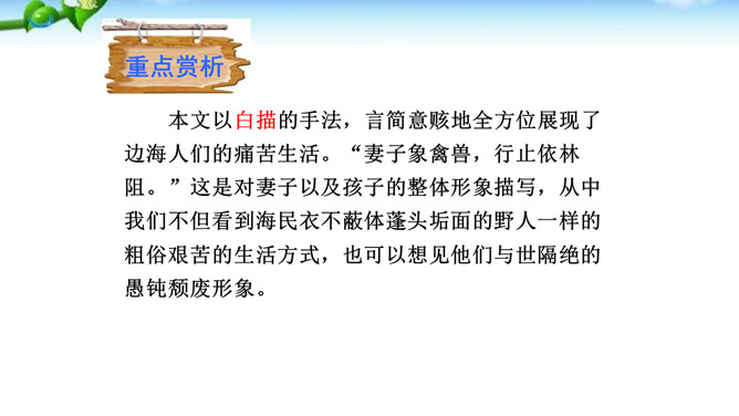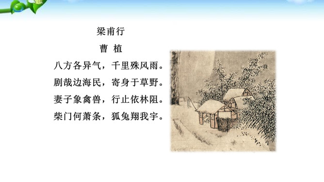 本文以白描的手法,言简意赅地全方位展现了边海人们的痛苦生活。“妻子象禽兽,行止依林阻。”这是对妻子以及孩子的整体形象描写,从中我们不但看到海民衣不蔽体蓬头垢面的野人一样的粗俗艰苦的生活方式,也可以想见他们与世隔绝的愚钝颓废形象。他们依靠自然环境的险阻,和野兽争夺生存空间,他们不但经受生活的艰难困苦,而且还有随时被野兽吃掉的生存忧惧。“柴门何萧条,狐兔翔我宇。”柴门简陋凄清,在海风中嗦嗦摇荡,狐狸兔子好像从天上飞来一样从屋檐下飞来窜去。所属专题:梁甫行ppt。