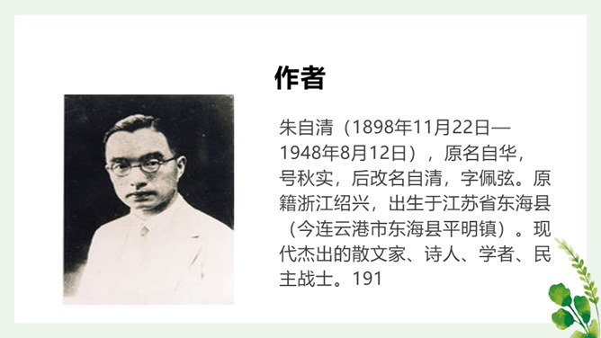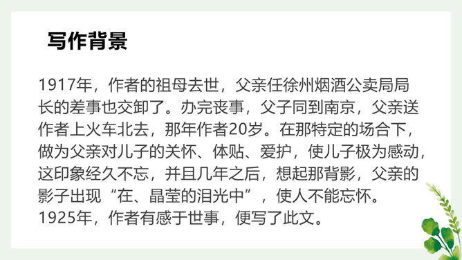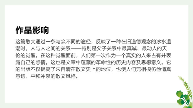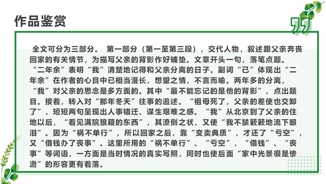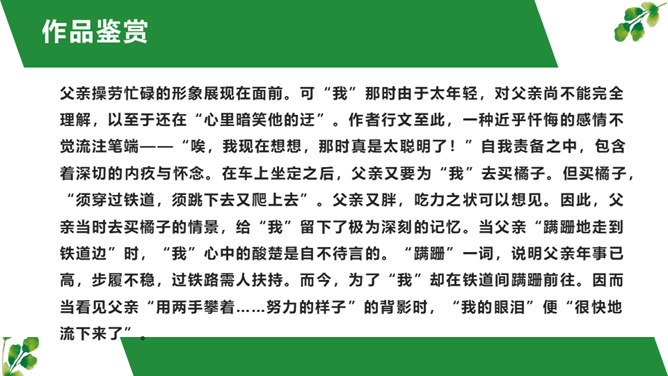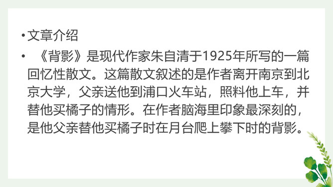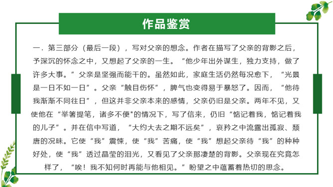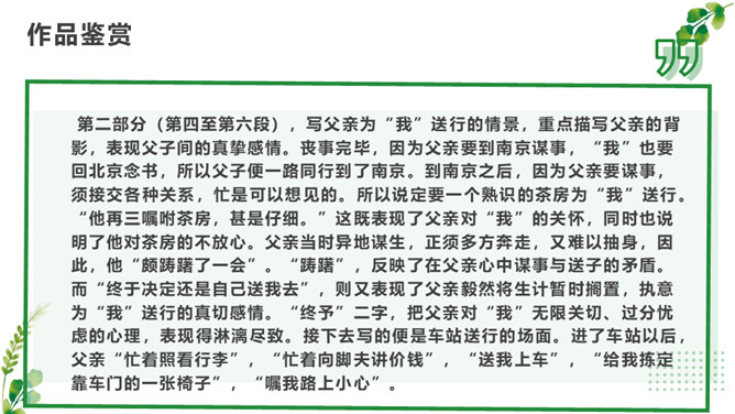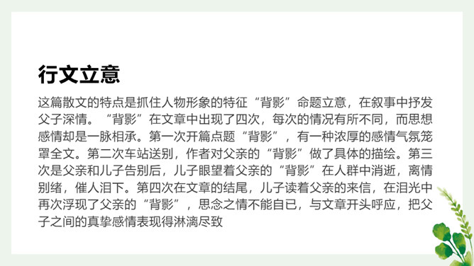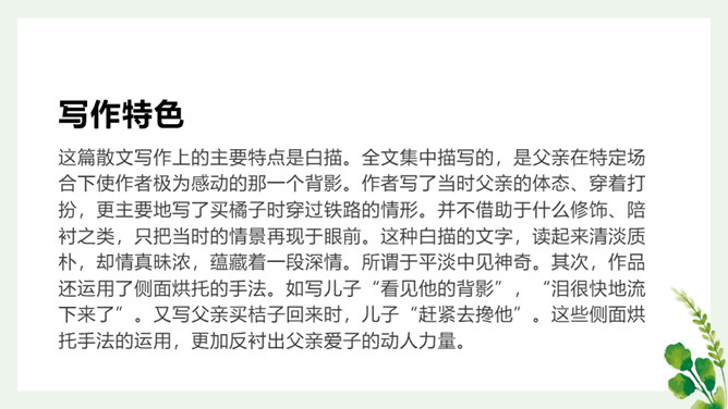 这篇散文写作上的主要特点是白描。全文集中描写的,是父亲在特定场合下使作者极为感动的那一个背影。作者写了当时父亲的体态、穿着打扮,更主要地写了买橘子时穿过铁路的情形。并不借助于什么修饰、陪衬之类,只把当时的情景再现于眼前。这种白描的文字,读起来清淡质朴,却情真昧浓,蕴藏着一段深情。所谓于平淡中见神奇。其次,作品还运用了侧面烘托的手法。如写儿子“看见他的背影”,“泪很快地流下来了”。又写父亲买桔子回来时,儿子“赶紧去搀他”。这些侧面烘托手法的运用,更加反衬出父亲爱子的动人力量。所属专题:背影ppt。