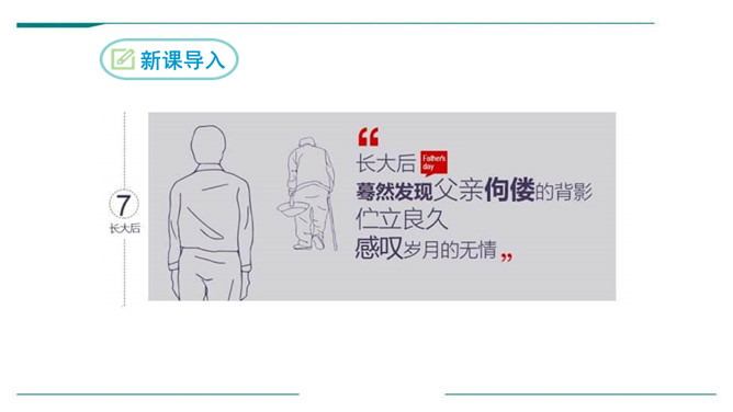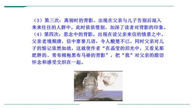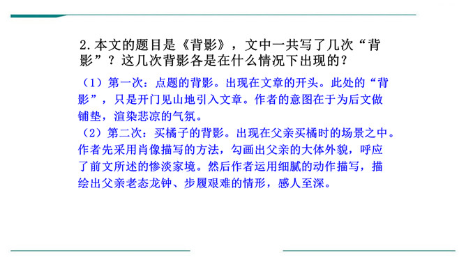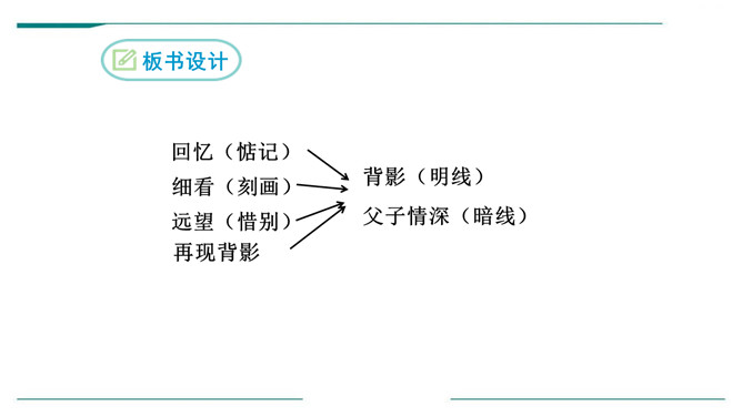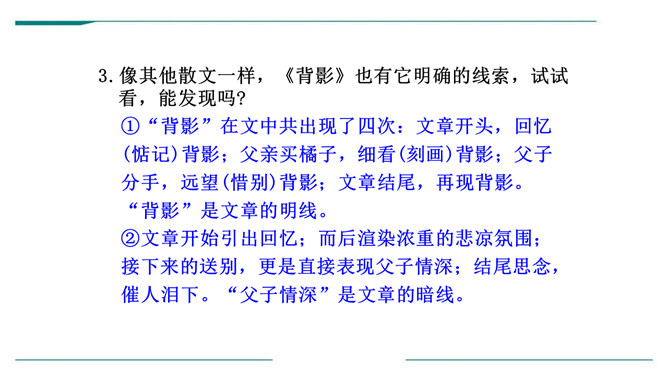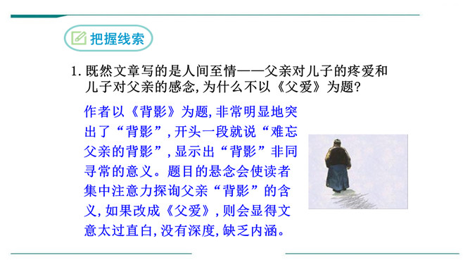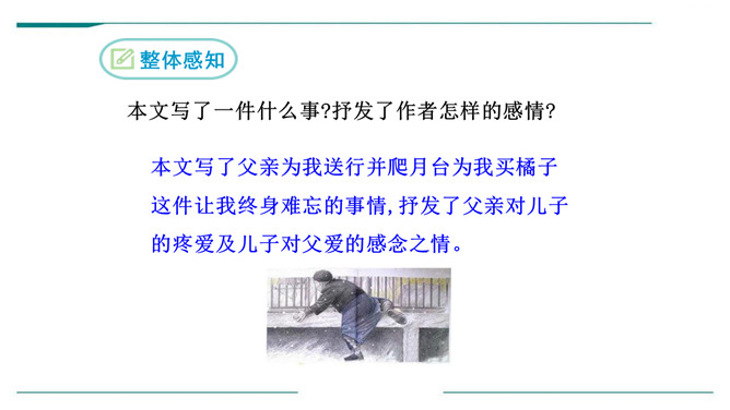 本文写了一件什么事?抒发了作者怎样的感情?本文写了父亲为我送行并爬月台为我买橘子这件让我终身难忘的事情,抒发了父亲对儿子的疼爱及儿子对父爱的感念之情。既然文章写的是人间至情——父亲对儿子的疼爱和儿子对父亲的感念,为什么不以《父爱》为题? 作者以《背影》为题,非常明显地突出了“背影”,开头一段就说“难忘父亲的背影”,显示出“背影”非同寻常的意义。题目的悬念会使读者集中注意力探询父亲“背影”的含义,如果改成《父爱》,则会显得文意太过直白,没有深度,缺乏内涵。所属专题:背影ppt。