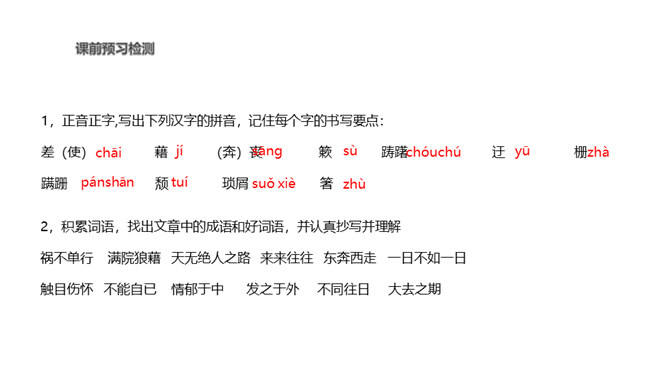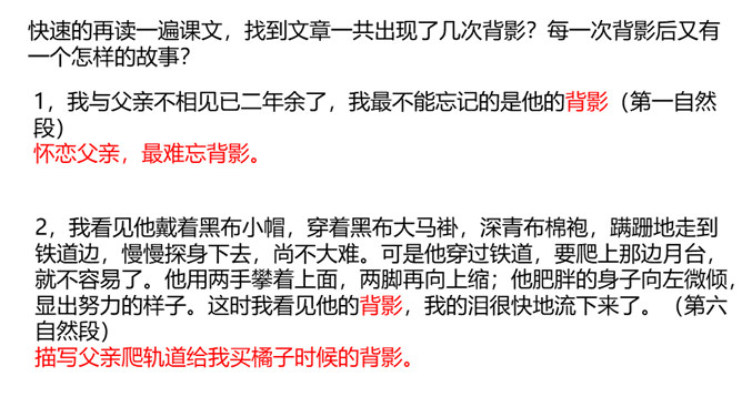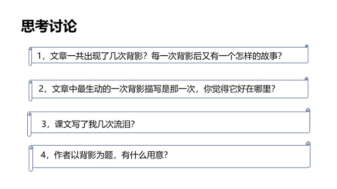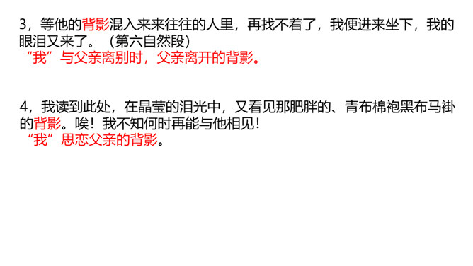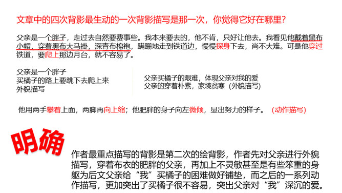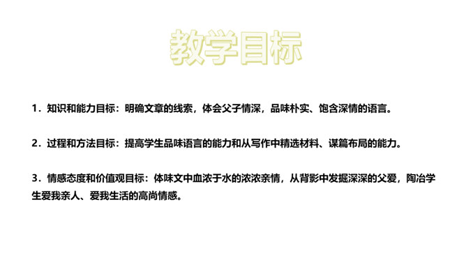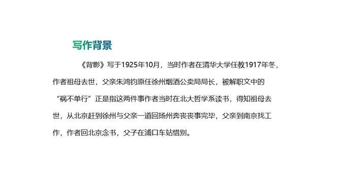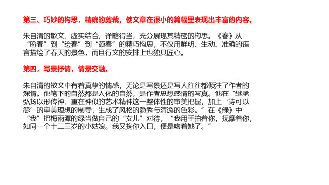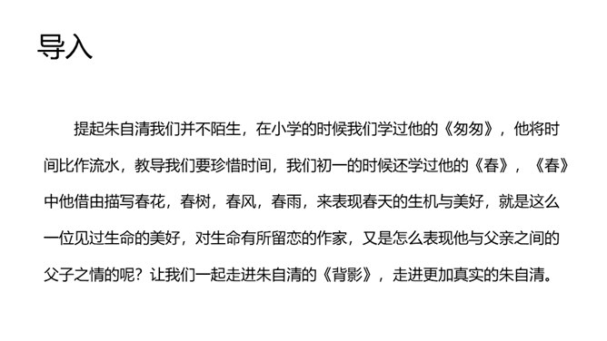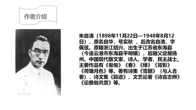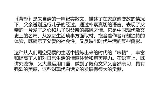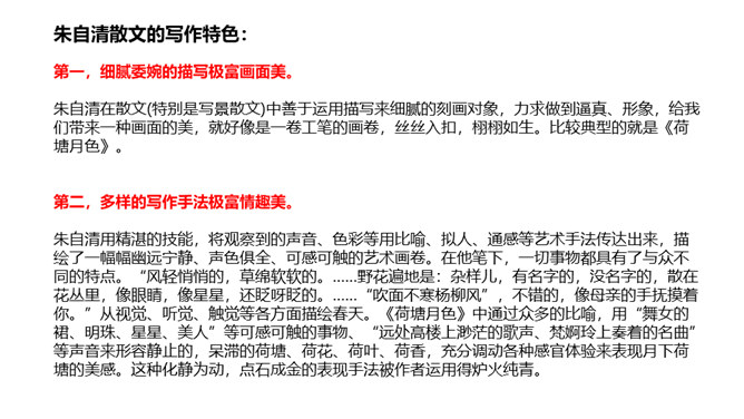 朱自清散文的写作特色:第一,细腻委婉的描写极富画面美。朱自清在散文(特别是写景散文)中善于运用描写来细腻的刻画对象,力求做到逼真、形象,给我们带来一种画面的美,就好像是一卷工笔的画卷,丝丝入扣,栩栩如生。比较典型的就是《荷塘月色》。第二,多样的写作手法极富情趣美。朱自清用精湛的技能,将观察到的声音、色彩等用比喻、拟人、通感等艺术手法传达出来,描绘了一幅幅幽远宁静、声色俱全、可感可触的艺术画卷。在他笔下,一切事物都具有了与众不同的特点。所属专题:背影ppt。