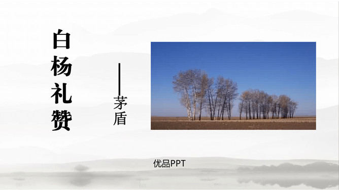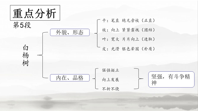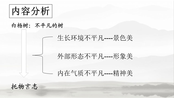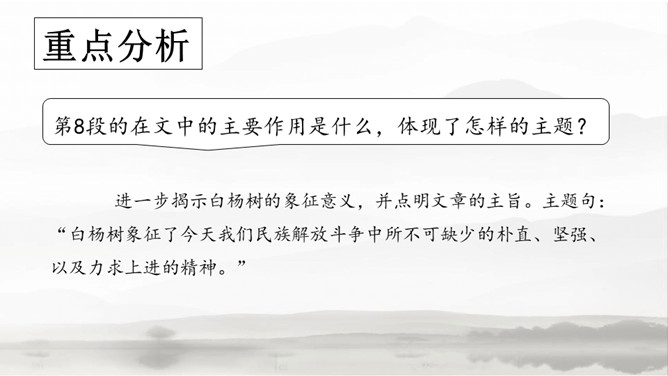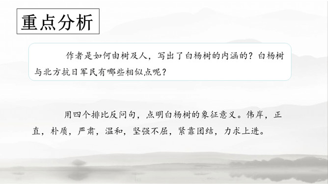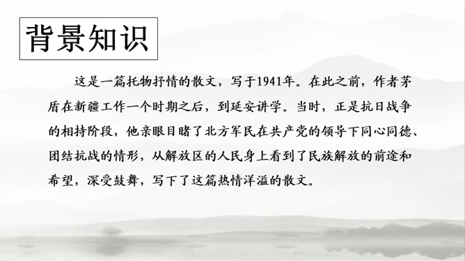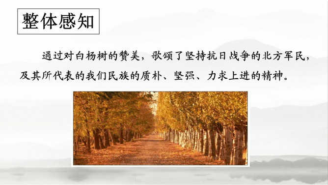 这是一篇托物抒情的散文,写于1941年。在此之前,作者茅盾在新疆工作一个时期之后,到延安讲学。当时,正是抗日战争的相持阶段,他亲眼目睹了北方军民在共产党的领导下同心同德、团结抗战的情形,从解放区的人民身上看到了民族解放的前途和希望,深受鼓舞,写下了这篇热情洋溢的散文。通过对白杨树的赞美,歌颂了坚持抗日战争的北方军民,及其所代表的我们民族的质朴、坚强、力求上进的精神。作者是如何由树及人,写出了白杨树的内涵的?白杨树与北方抗日军民有哪些相似点呢?所属专题:白杨礼赞ppt。