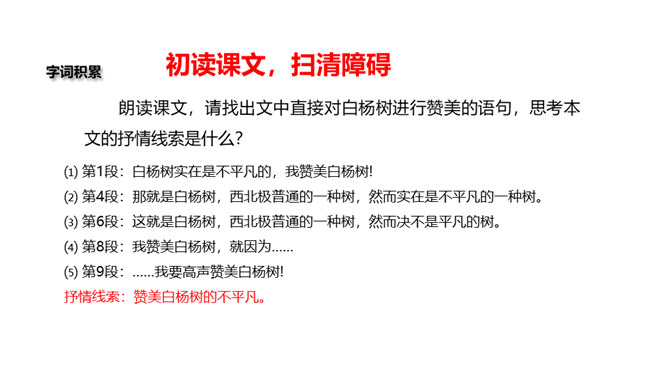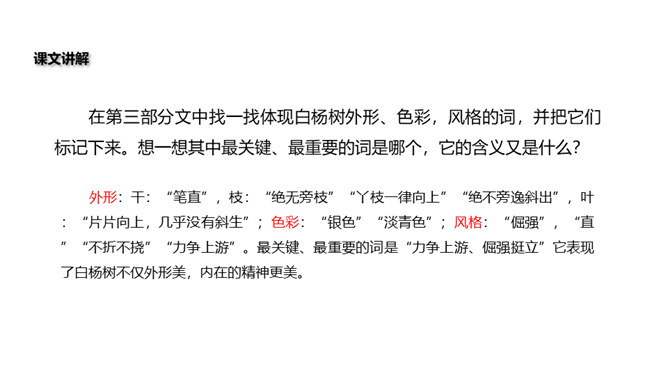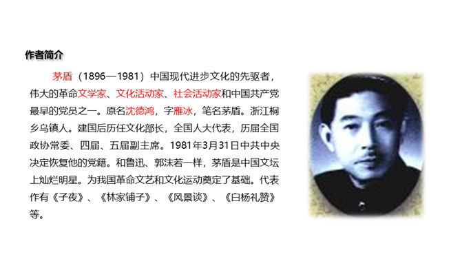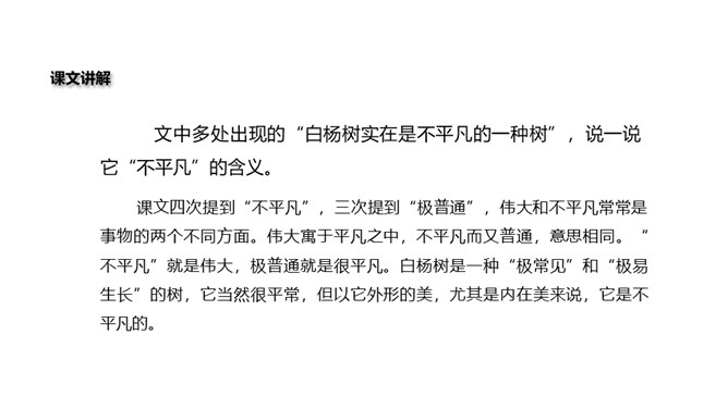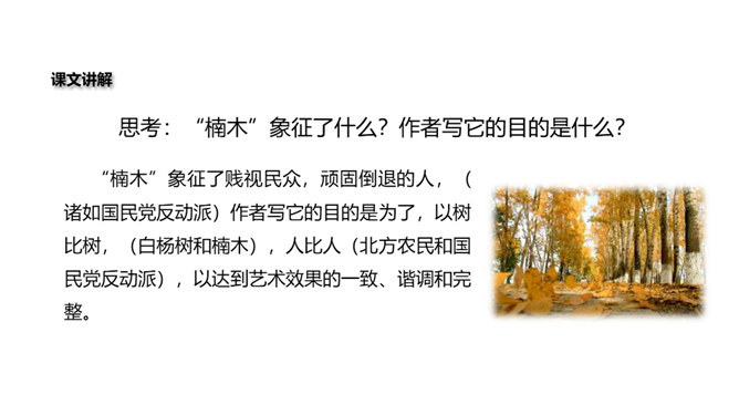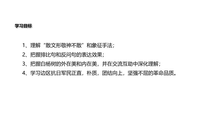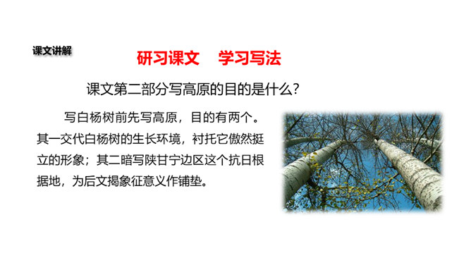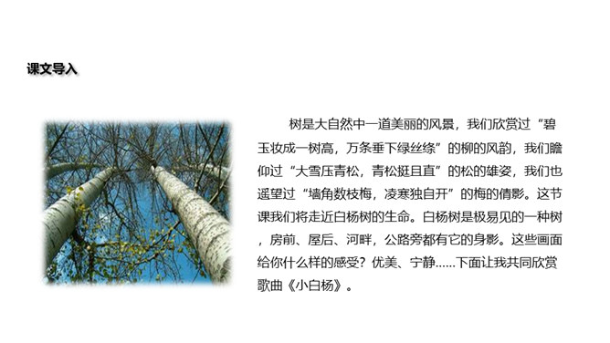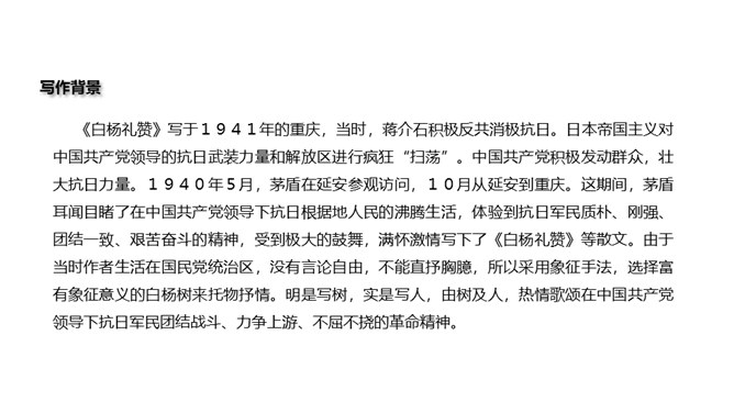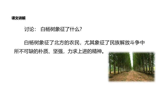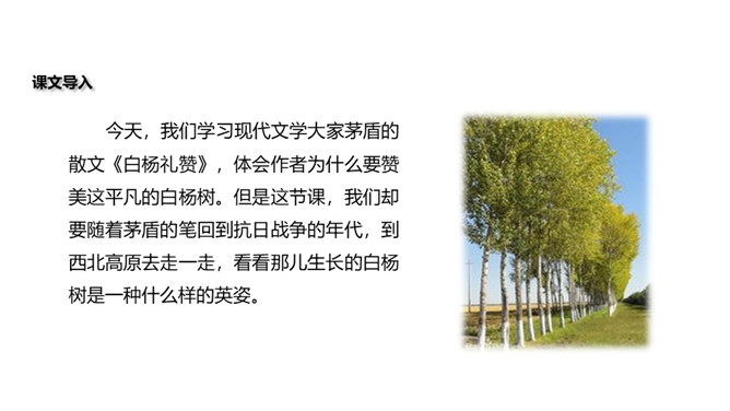 树是大自然中一道美丽的风景,我们欣赏过“碧玉妆成一树高,万条垂下绿丝绦”的柳的风韵,我们瞻仰过“大雪压青松,青松挺且直”的松的雄姿,我们也遥望过“墙角数枝梅,凌寒独自开”的梅的倩影。这节课我们将走近白杨树的生命。白杨树是极易见的一种树,房前、屋后、河畔,公路旁都有它的身影。这些画面给你什么样的感受?今天,我们学习现代文学大家茅盾的散文,体会作者为什么要赞美这平凡的白杨树。但是这节课,我们却要随着茅盾的笔回到抗日战争的年代,到西北高原去走一走,看看那儿生长的白杨树是一种什么样的英姿。所属专题:白杨礼赞ppt。