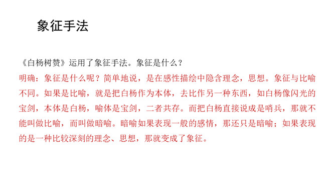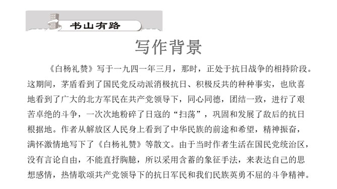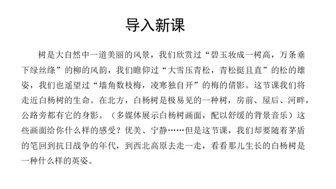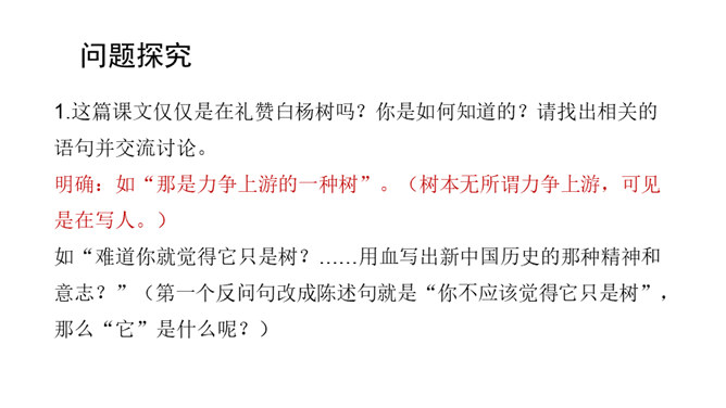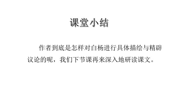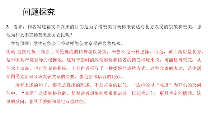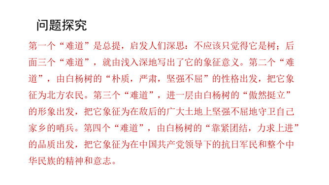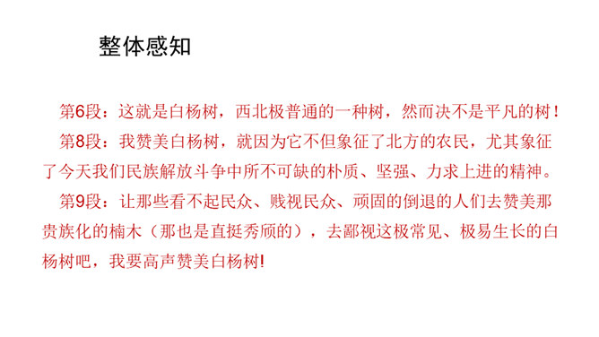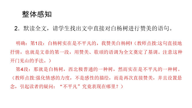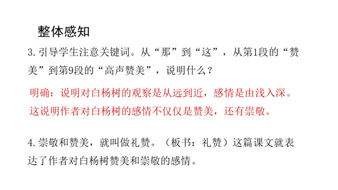 默读全文,请学生找出文中直接对白杨树进行赞美的语句。明确:第1段:白杨树实在是不平凡的,我赞美白杨树!(教师点拨:这句直接地抒情,也就是文章的第一段,用赞美、歌颂的语调为全文奠定了基调。注意这种开门见山的手法。)第4段:那就是白杨树,西北极普通的一种树,然而实在是不平凡的一种树。(教师点拨:强化情感的力度,不是感性的描绘,而是再次直接赞美,并且设置悬念,引起读者的疑问:“不平凡”究竟表现在哪里?)引导学生注意关键词。从“那”到“这”,从第1段的“赞美”到第9段的“高声赞美”,说明什么?所属专题:白杨礼赞ppt。