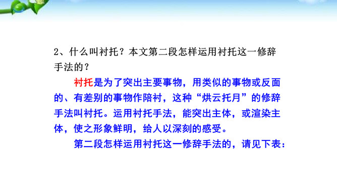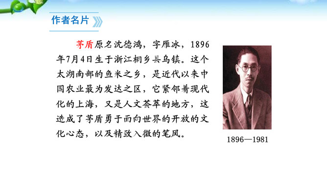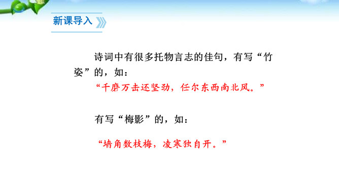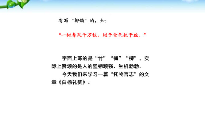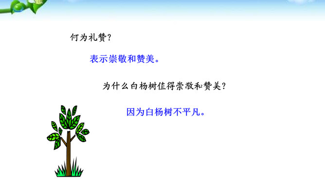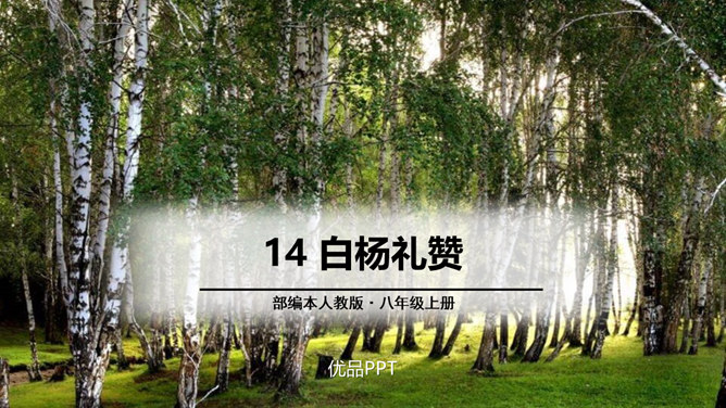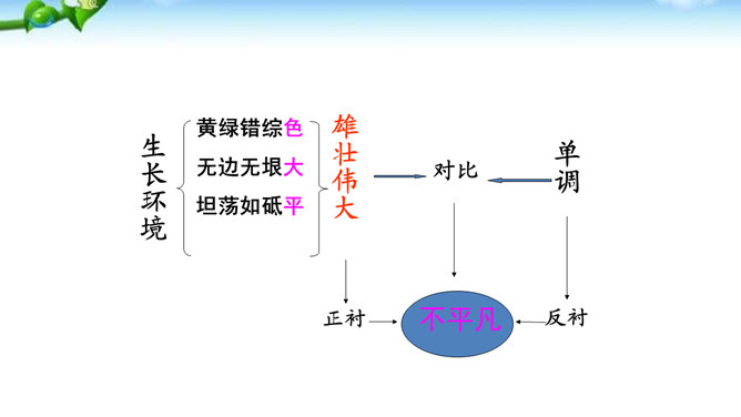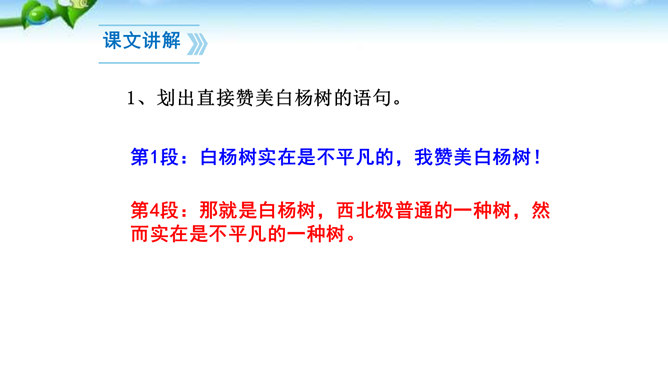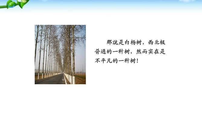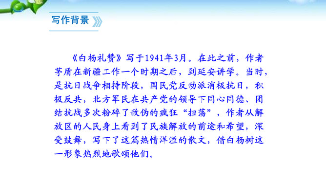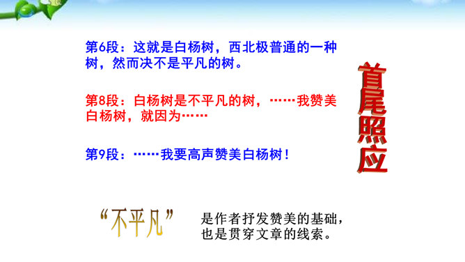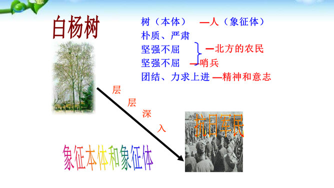 朗读课文,理清课文层次。第一部分(1):开篇点题,直接抒发对白杨树的赞美、崇敬之情。第二部分(2-8):由远及近,由表及里地抒写白杨树的“不平凡”,点明其象征意义。第三部分(9):对比楠木,再赞白杨,呼应开头。四个“难道”反问句式 ,层层递进、层出迭见,气势恢弘,由赞美树到赞美人,过渡自然。第一个“难道”句,引导读者把白杨树与人联系起来思考,由树及人。第二个“难道”句,引导读者把白杨树的品质与北方农民的品质联系起来,点明象征北方农民。所属专题:白杨礼赞ppt。