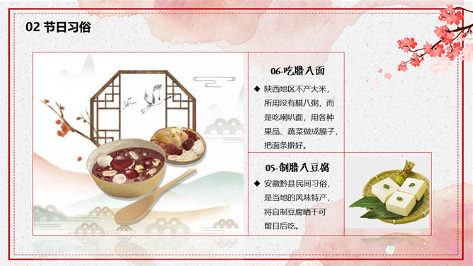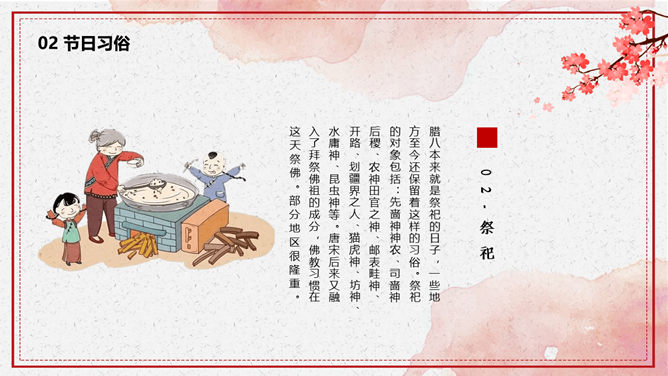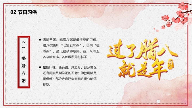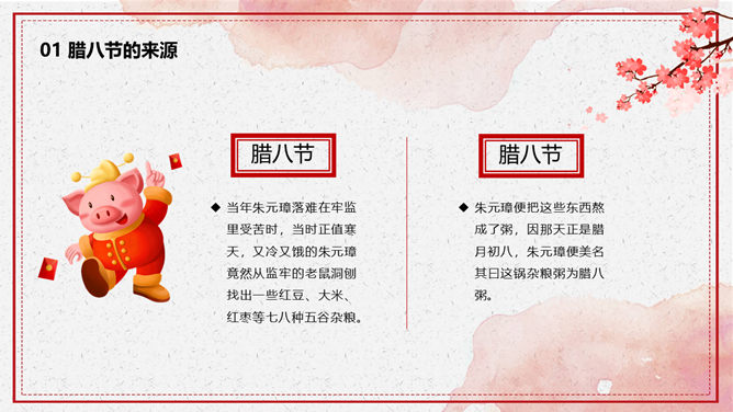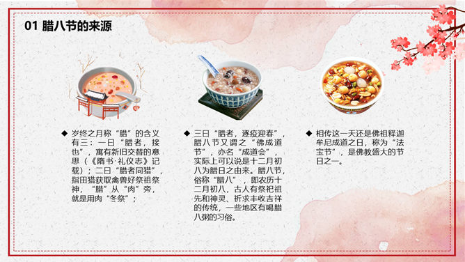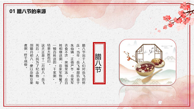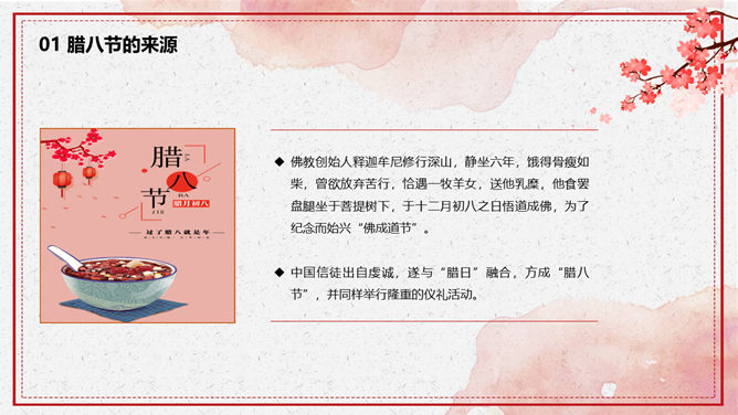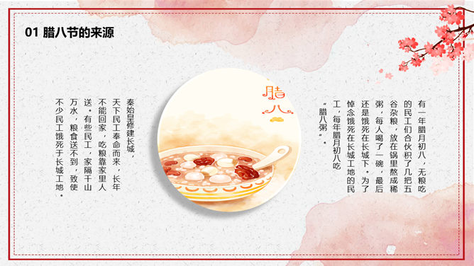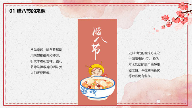 腊八节由来习俗介绍PPT模板。一套腊八节主题幻灯片模板,介绍了腊八节的来源和风俗习惯、腊八粥和腊八诗词等内容。