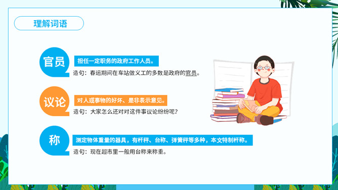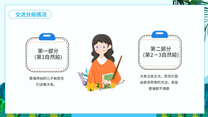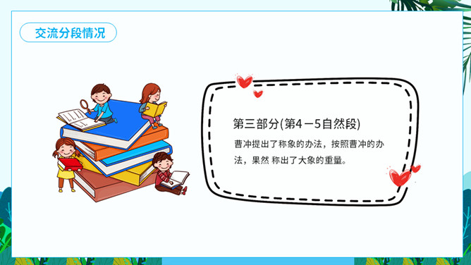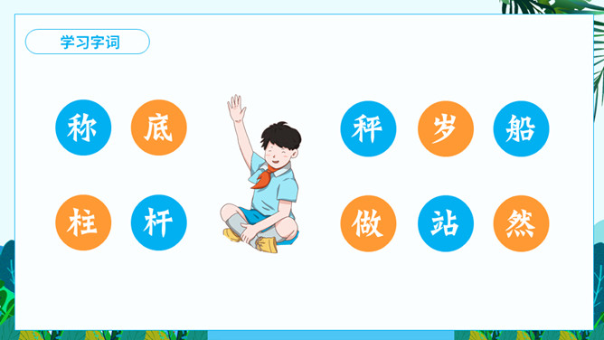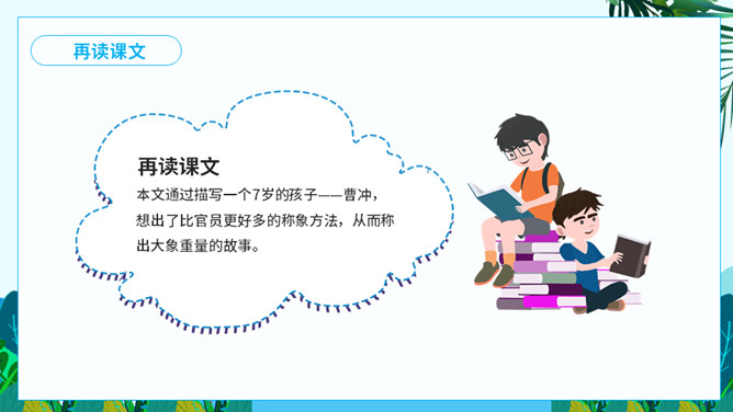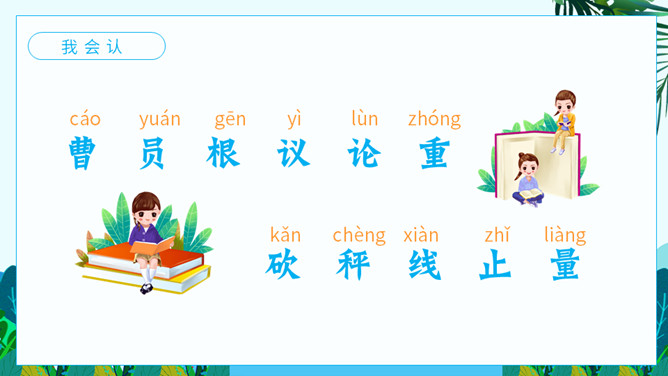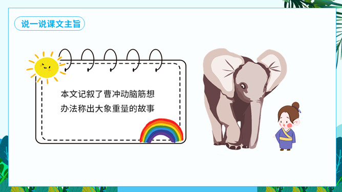 学习目标:学习本课生字,能正确读写生字词语。正确、流利、有感情地朗读课文,初步感知课文内容。(重点) 请同学们自由朗读课文,努力读准字音、读通句子。想一想:课文写了什么?指名读课文,同学互评:字音是否正确,句子是否通顺。本文记叙了曹冲动脑筋想办法称出大象重量的故事。初读课文后,你感受到了什么?我们从读中感受到了遇事动脑筋,想办法,就能找到解决问题的方法。所属专题:曹冲称象ppt。