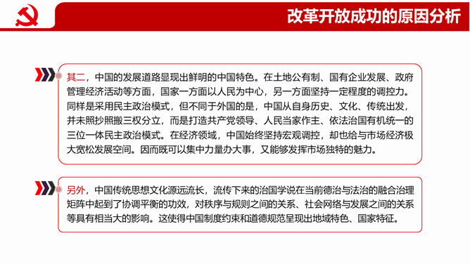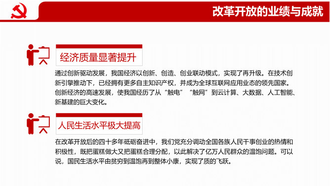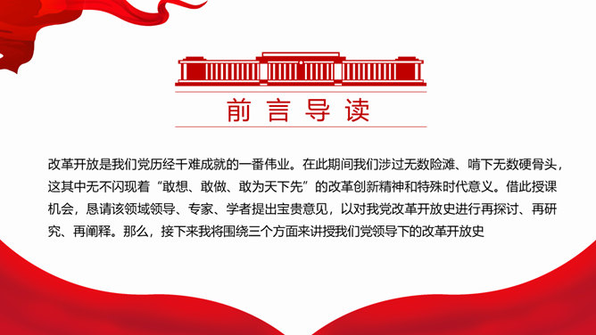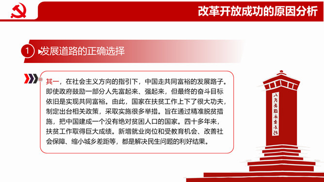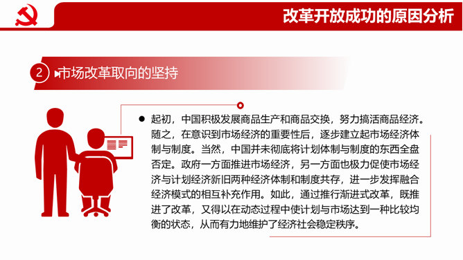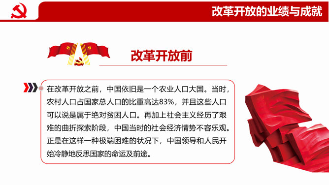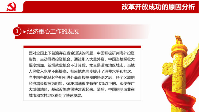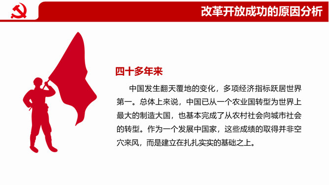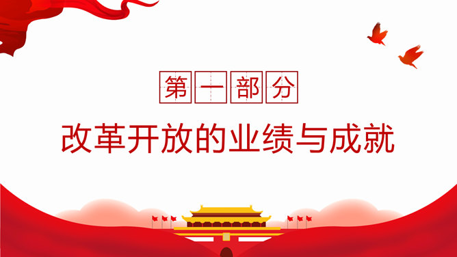 四史教育学习之改革开放史PPT模板。改革开放的业绩与成就、改革开放成功的原因分析、改革开放的未来思考。
