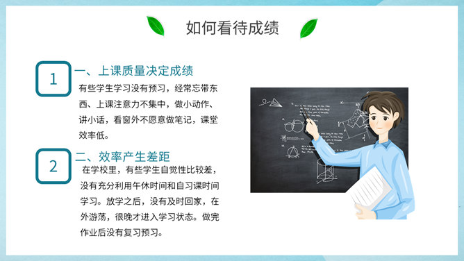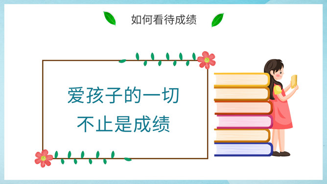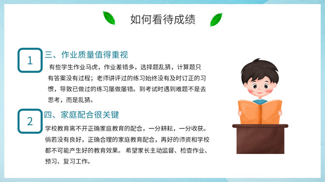 初中期末家长会PPT模板。包括考试成绩总结、如何看待成绩、初二学生特点、探讨家庭教育几个部分。