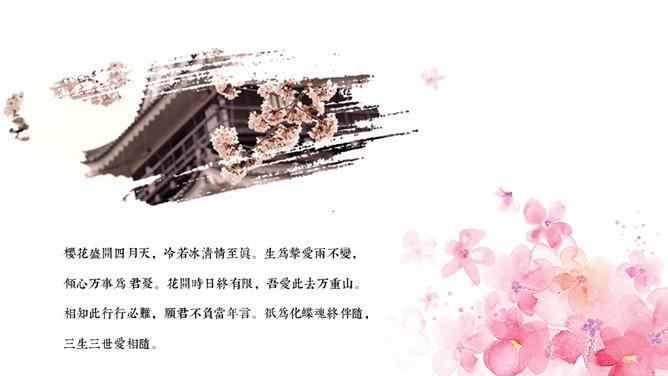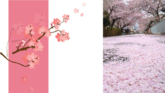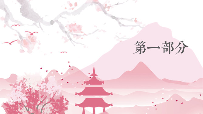 粉色樱花日本和风PPT模板。一套日本日式和风幻灯片模板,粉色主色调,樱花素材背景,适合日本相关主题介绍。