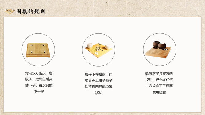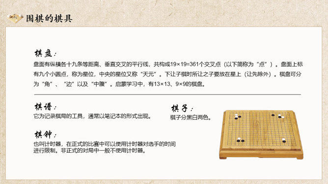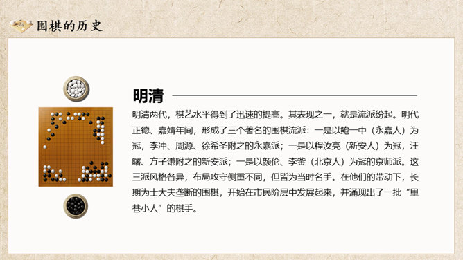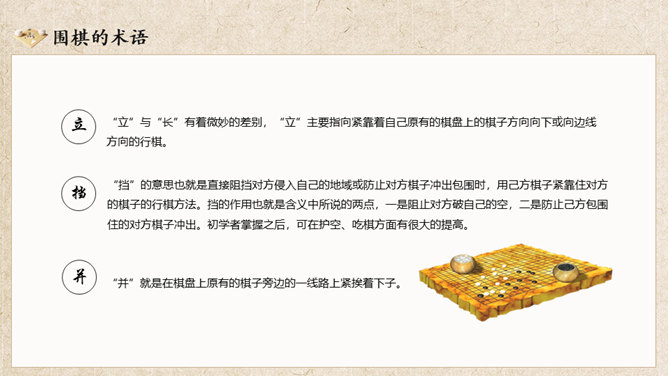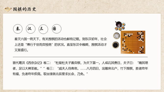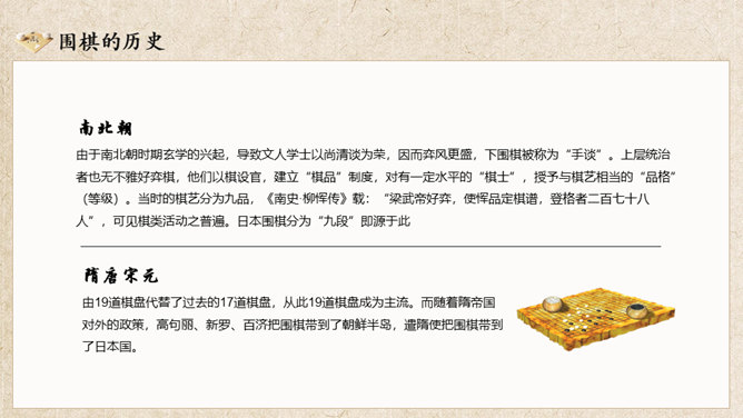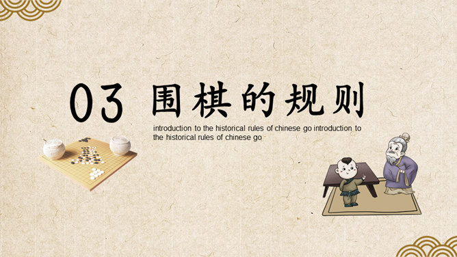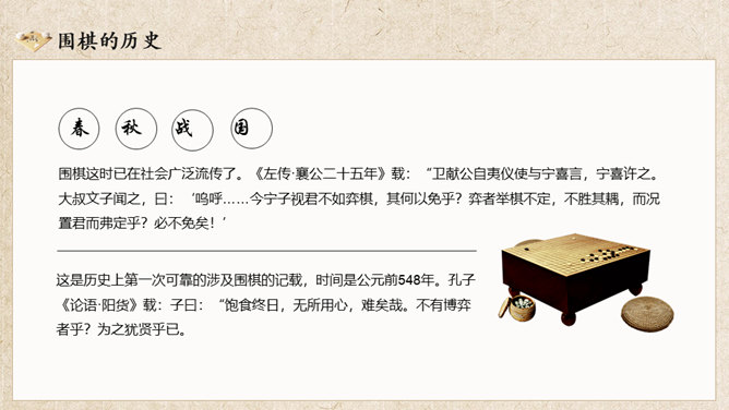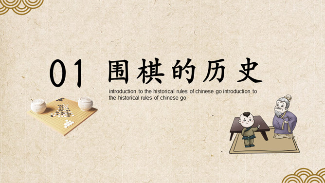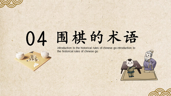 围棋入门基础知识介绍PT模板。复古风格设计,包括围棋的历史、围棋的棋具、围棋的规则、围棋的术语几部分。