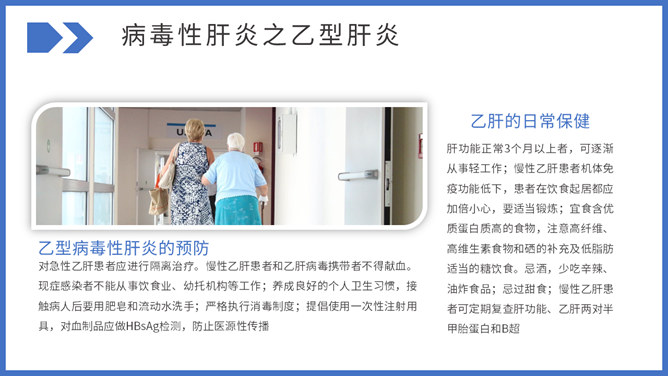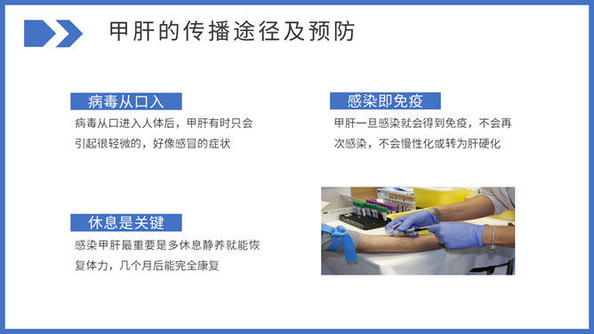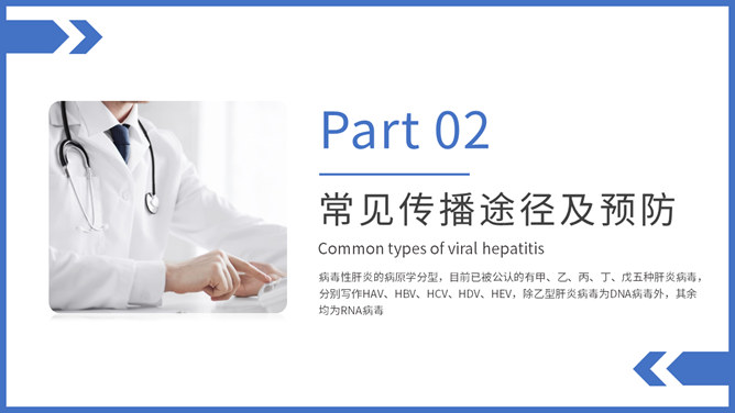病毒性肝炎预防和治疗PPT模板。包括病毒性肝炎常见类型、常见传播途径及预防、如何与肝炎患者相处三部分。