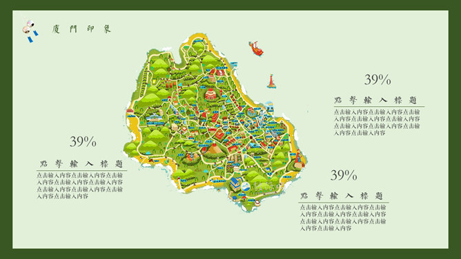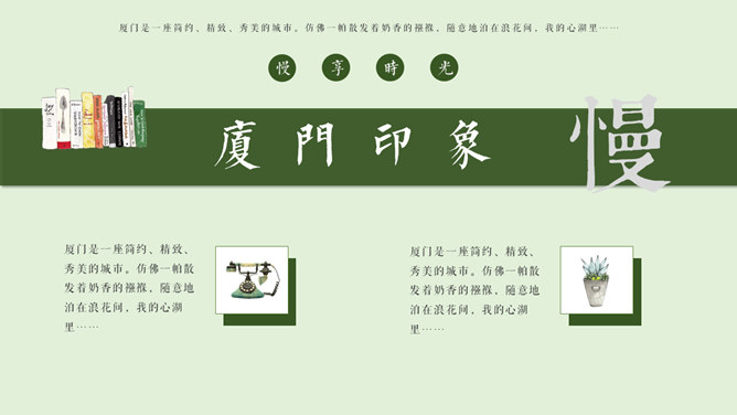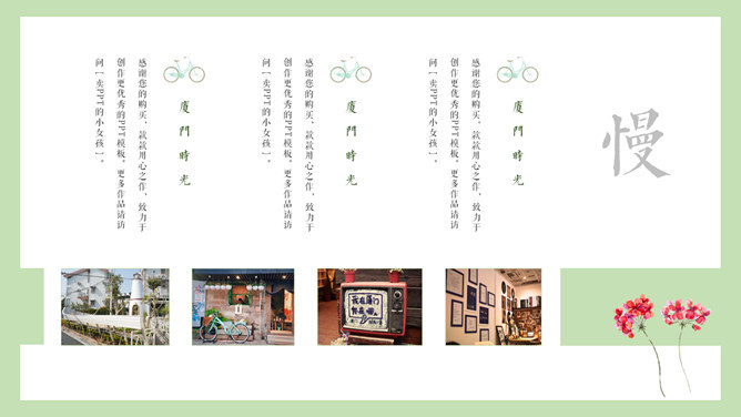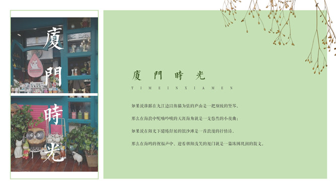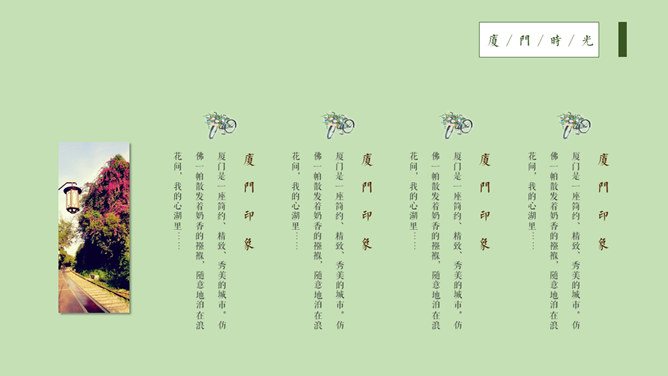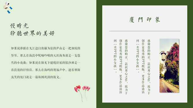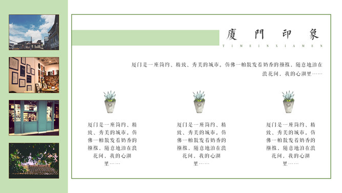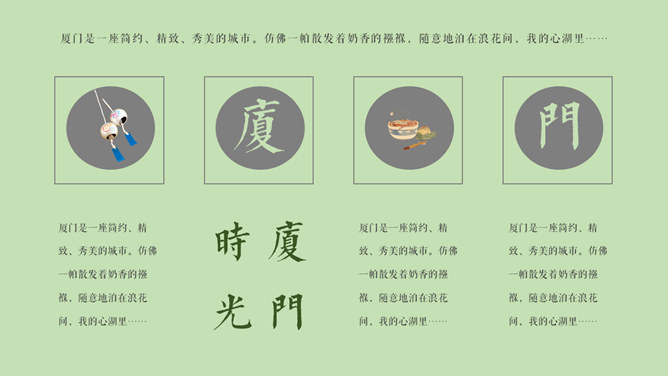 厦门旅游景点介绍攻略PPT模板。一套厦门旅行旅游介绍幻灯片模板,淡雅小清新设计,适合制作厦门旅游攻略相关内容。