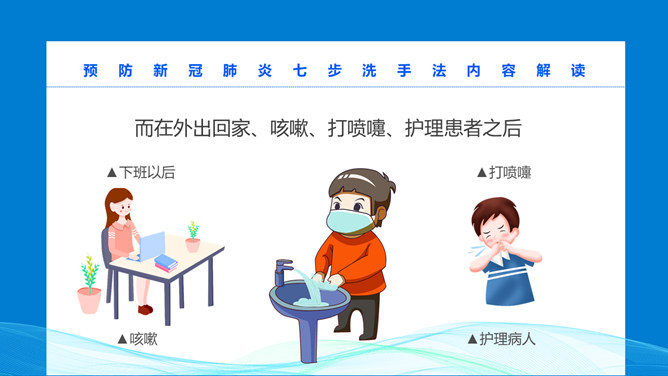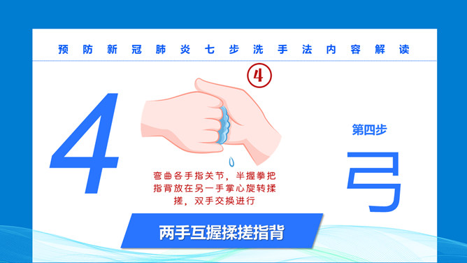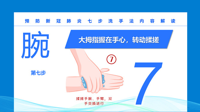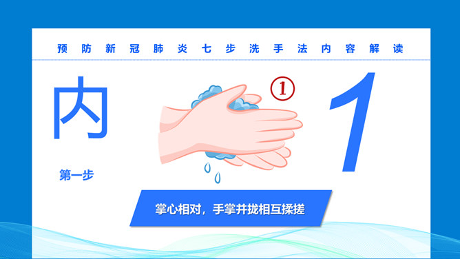 七步洗手法步骤PPT模板。预防新冠病毒,为了家人和朋友健康,防护从自己做起。不管是日常卫生注意事项,还是预防流行病策略,勤洗手是最有效隔离病菌的方法之一,内外夹攻大力丸七步洗手法。