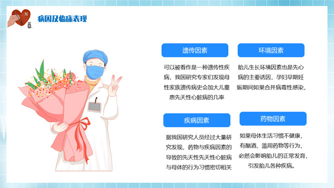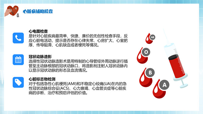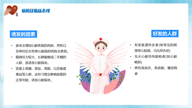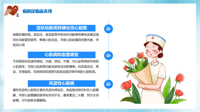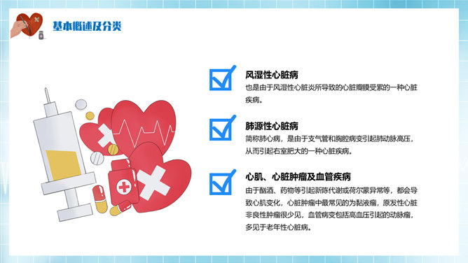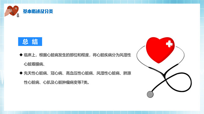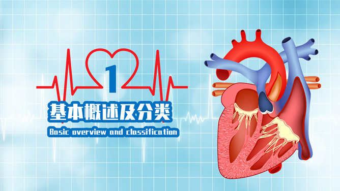 心脏病治疗护理PPT模板。基本概述及分类、病因及临床表现、心脏病辅助检查、心脏病治疗方法。