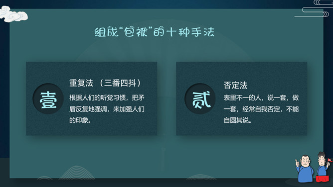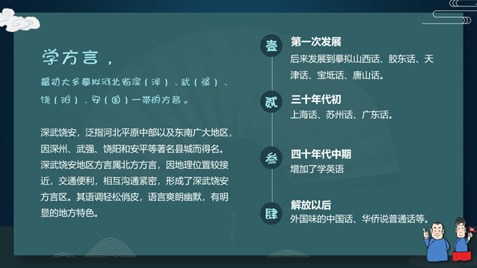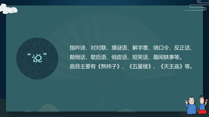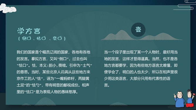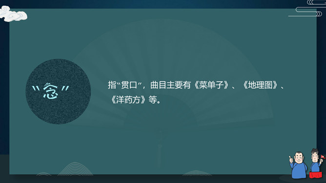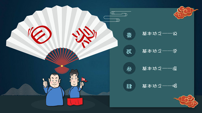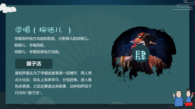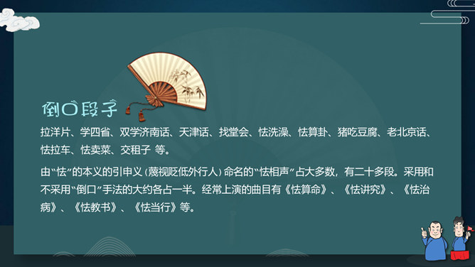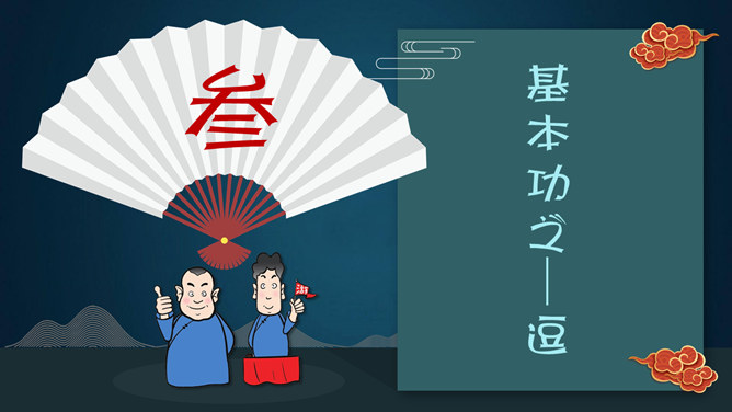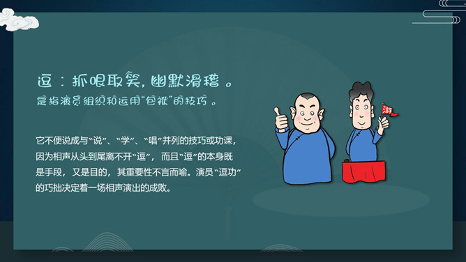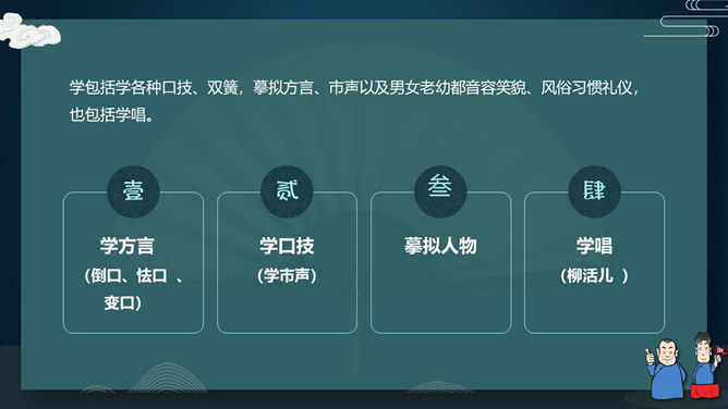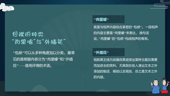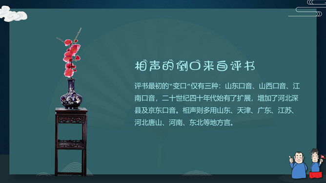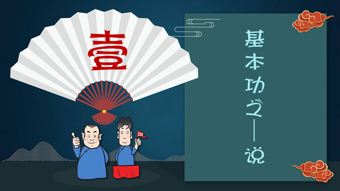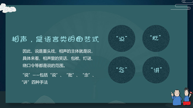 相声文化艺术基础知识介绍PPT模板。相声,是语言类的曲艺式,因此,说是重头戏,相声的主体就是说,具体来看,相声里的笑话、包袱、灯谜、绕口令等都是说的范围。“说”——包括“说”、“批”、“念”、“讲”四种手法。