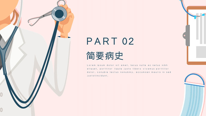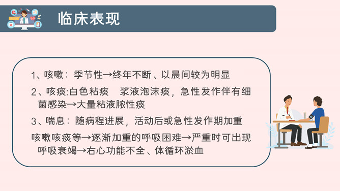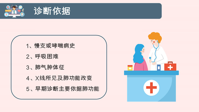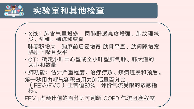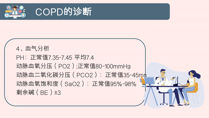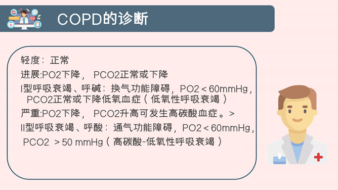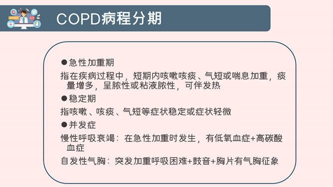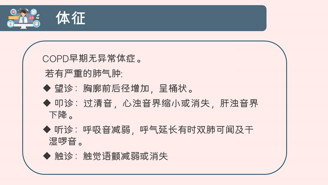 COPD患者护理查房PPT模板。包括相关知识介绍、简要病史、护理诊断与措施、健康教育四个部分。