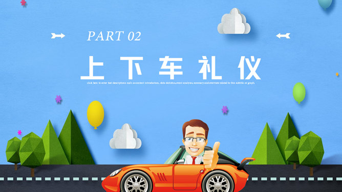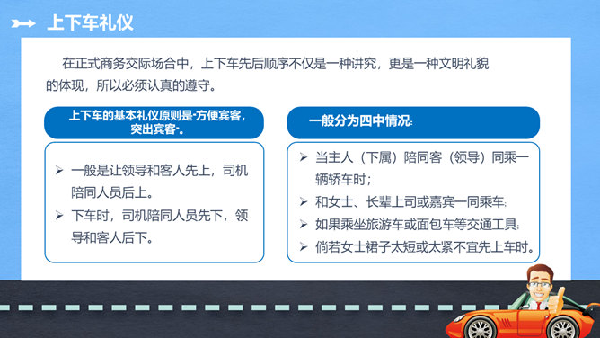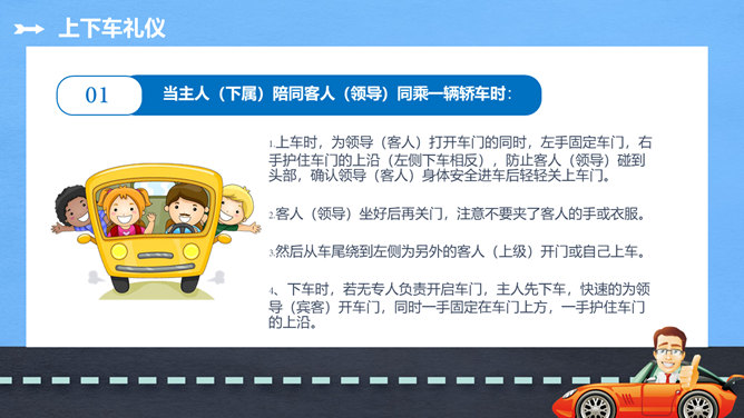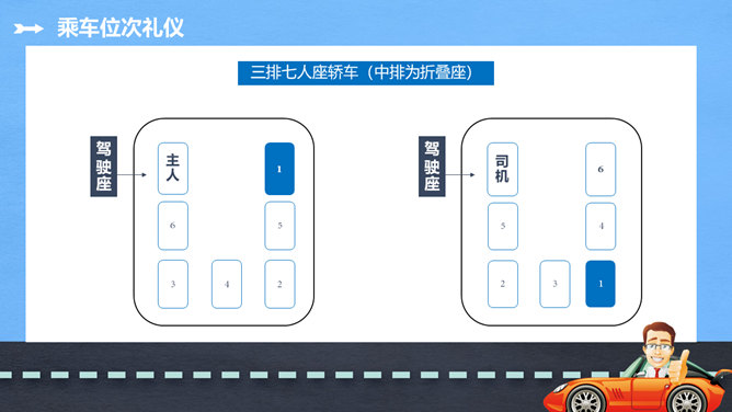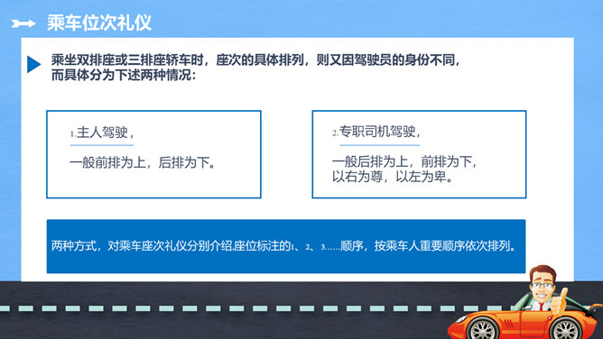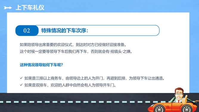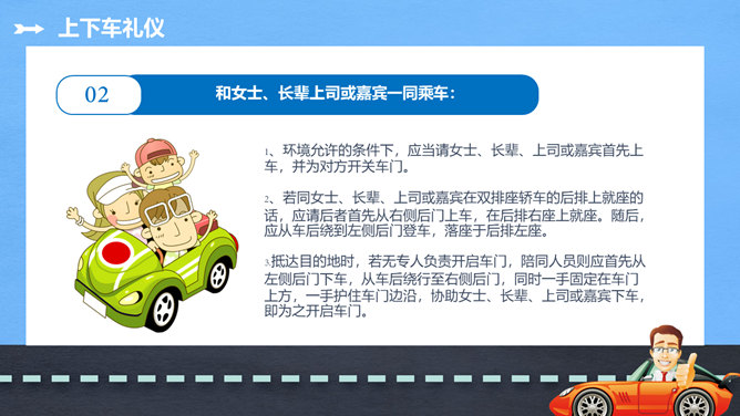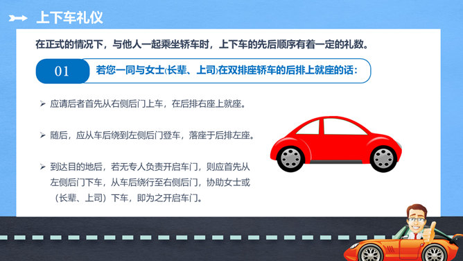 商务礼仪乘车礼仪培训PPT模板。商务社交乘车位次座次礼仪、上下车礼仪、乘车注意事项。