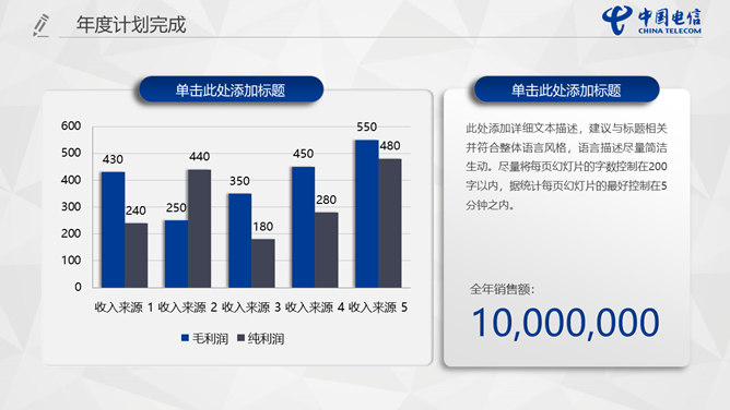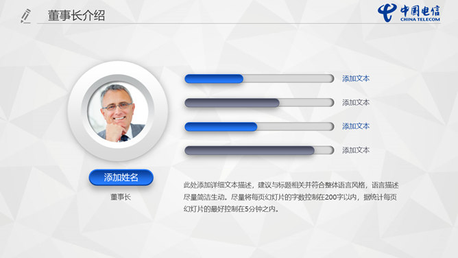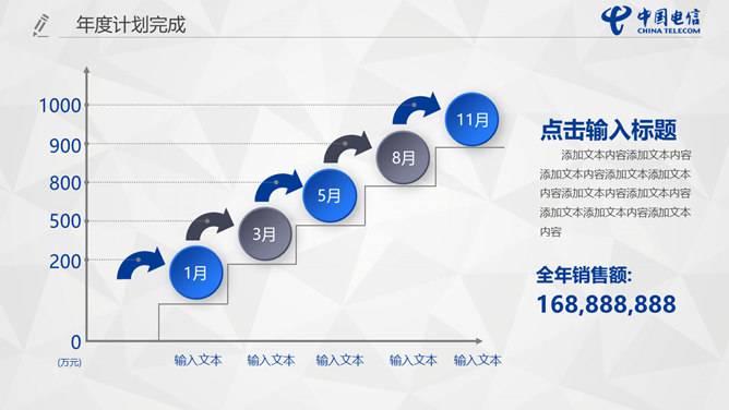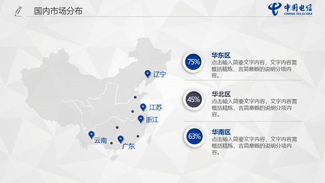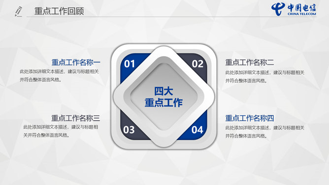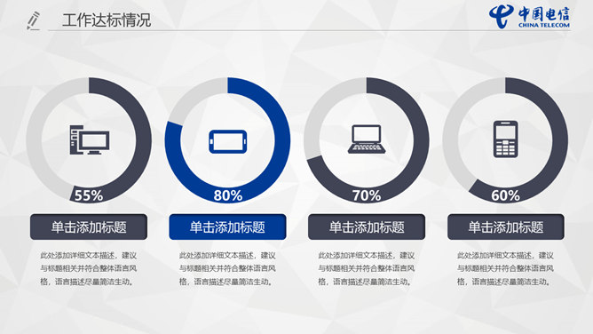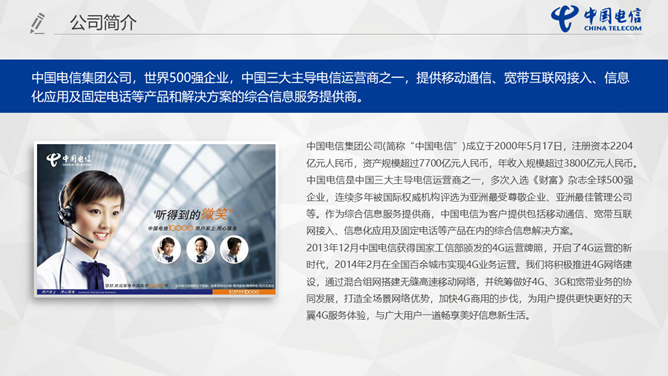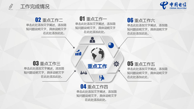 中国电信员工专用PPT模板。一套中国电信工作职工工作总结汇报计划幻灯片模板,页面类型丰富实用,动态播放。
