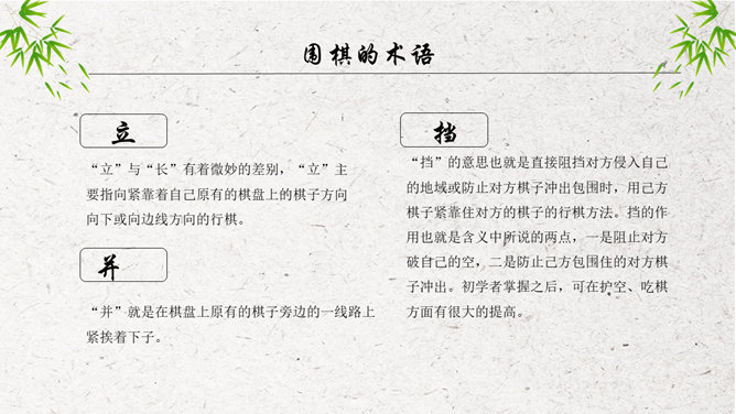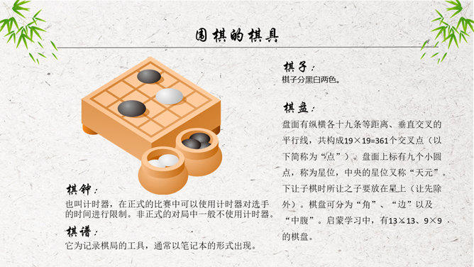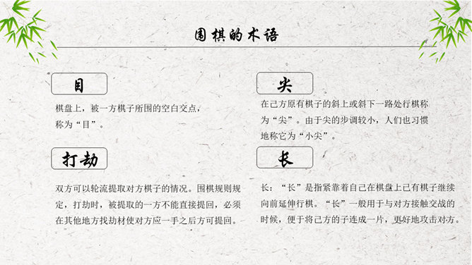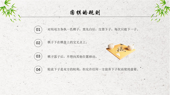 围棋入门常识知识PPT模板。包括围棋的历史、围棋的棋具、围棋的规则、围棋的术语四个部分。