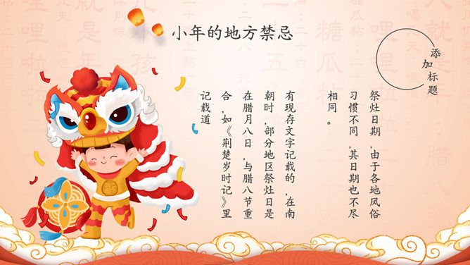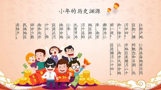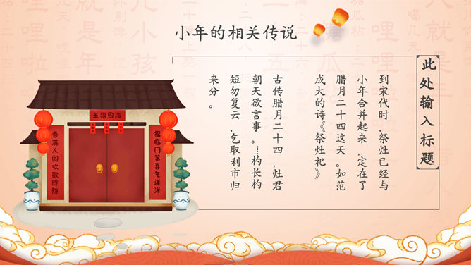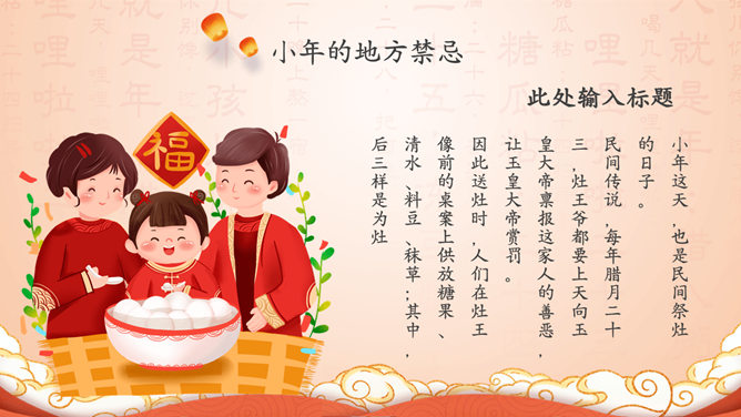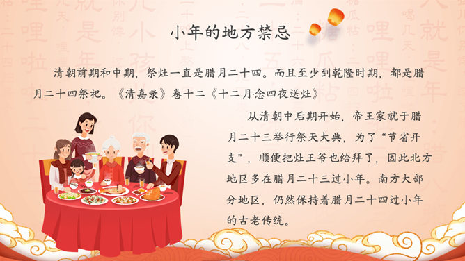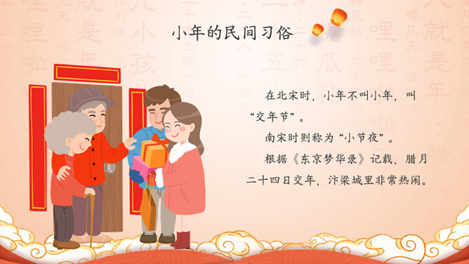 过小年习俗来历PPT模板。小年的历史渊源、小年的民间习俗、小年的地方禁忌、小年的相关传说。