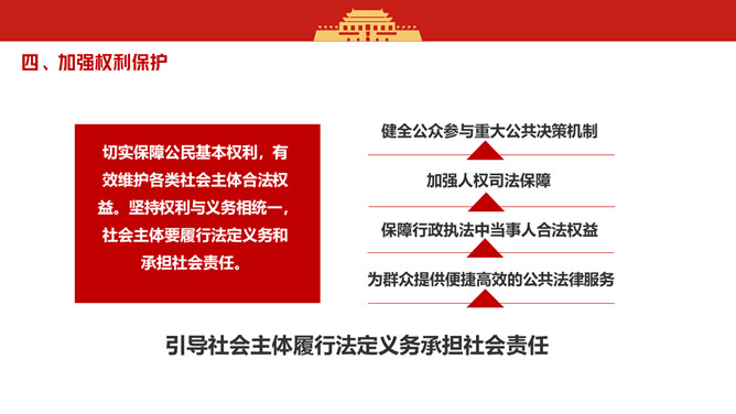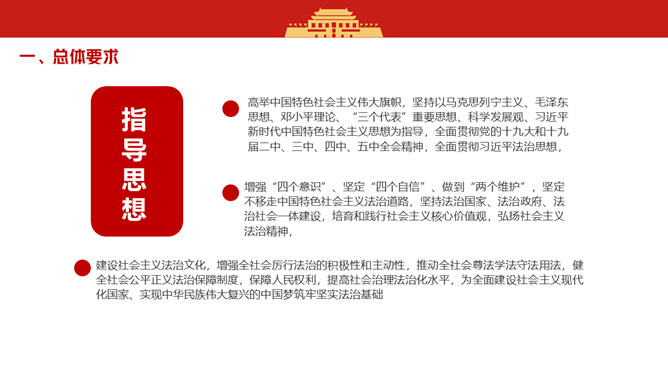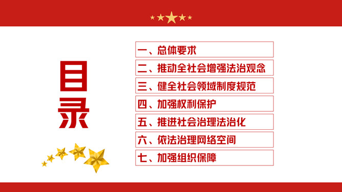法治社会建设实施纲要PPT模板。总体要求、推动全社会增强法治观念、健全社会领域制度规范、加强权利保护、推进社会治理法治化、依法治理网络空间、加强组织保障。