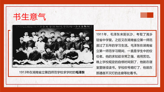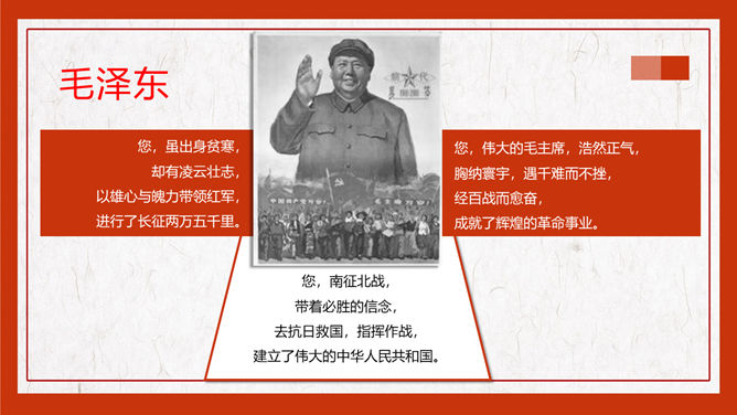 毛泽东毛主席纪念介绍PPT模板。一套毛主席主题幻灯片模板,适合毛泽东诞辰纪念或生平事迹介绍等用途。