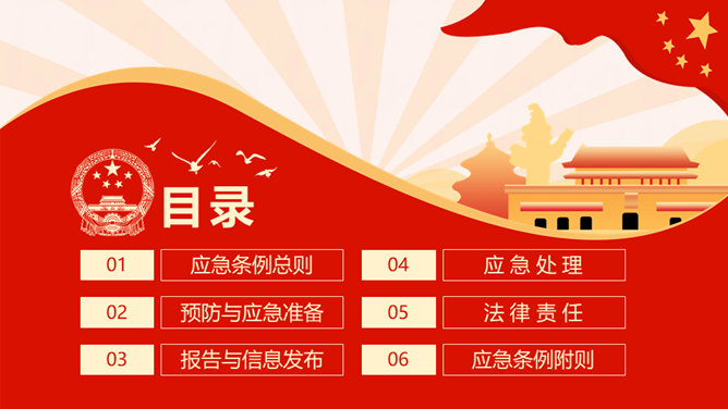 突发公共卫生事件应急条例PPT模板。应急条例总则、预防与应急准备、报告与信息发布、应急处理、法律责任、附则。