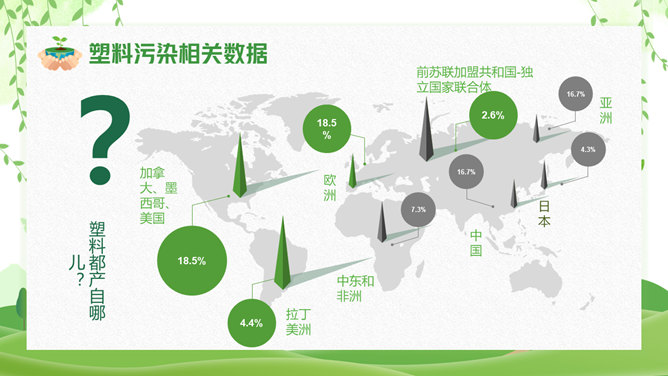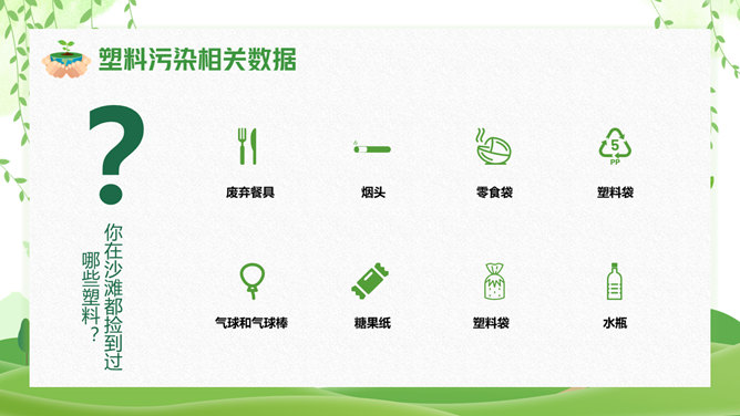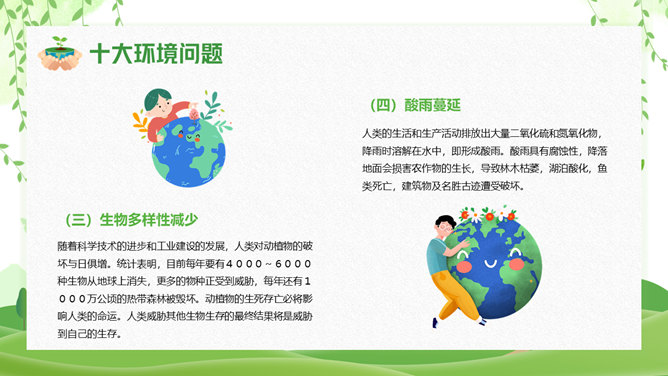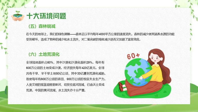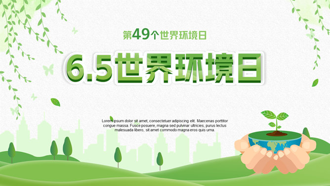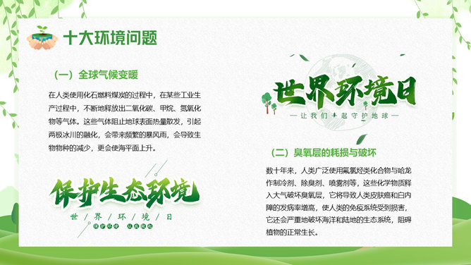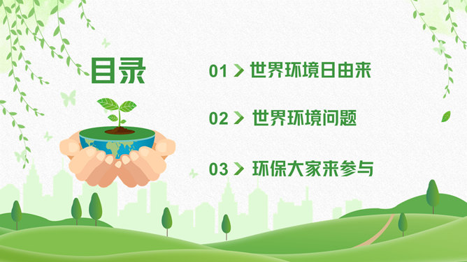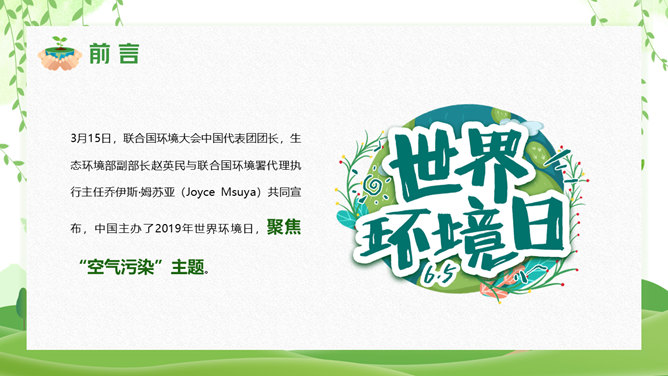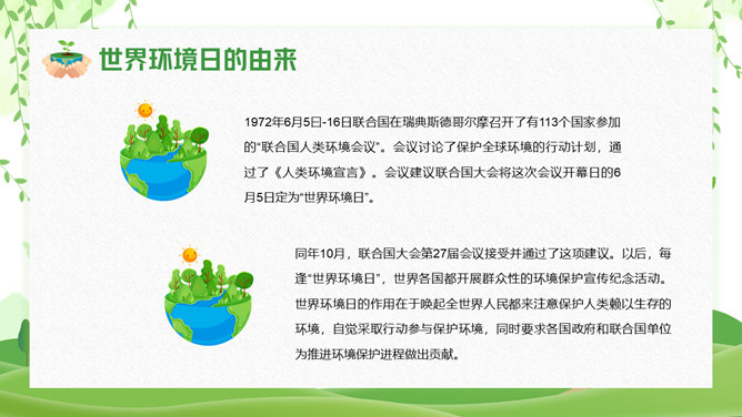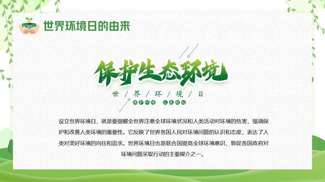 清新绿色世界环境日介绍PPT模板。绿色小清新风格,介绍了世界环境日由来、世界环境问题、环保大家来参与。