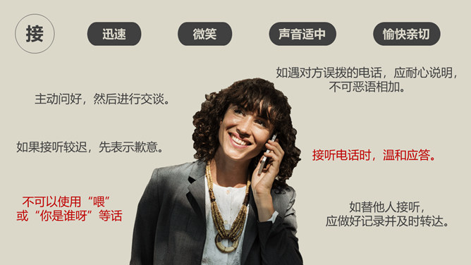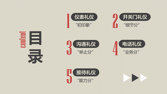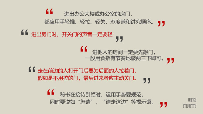 办公室礼仪培训PPT课件模板。包括仪表礼仪、开关门礼仪、沟通礼仪、电话礼仪、接待礼仪几个部分。