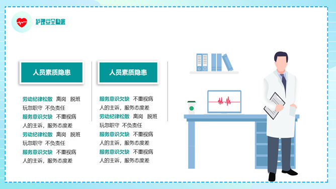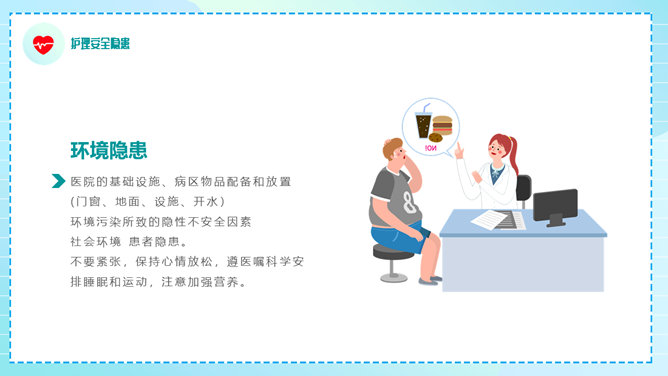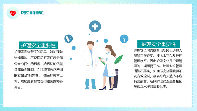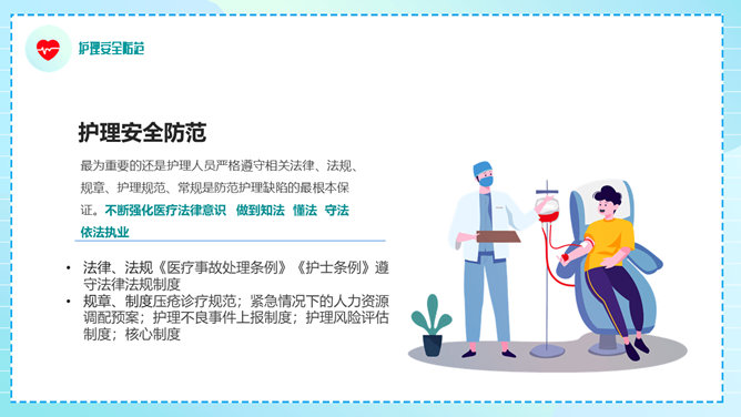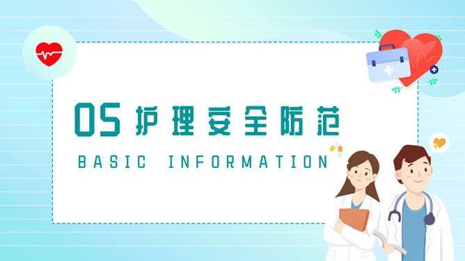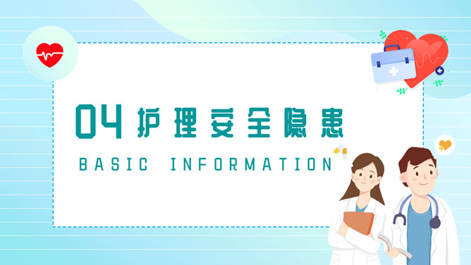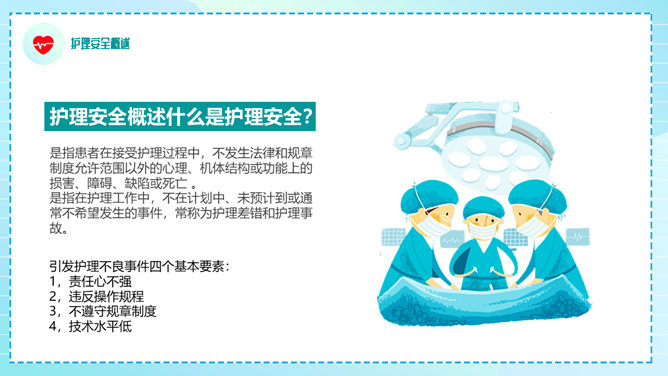 护理安全教育培训PPT模板。包括医疗护理安全现状、护理安全的重要性、概述、隐患和防范等内容。