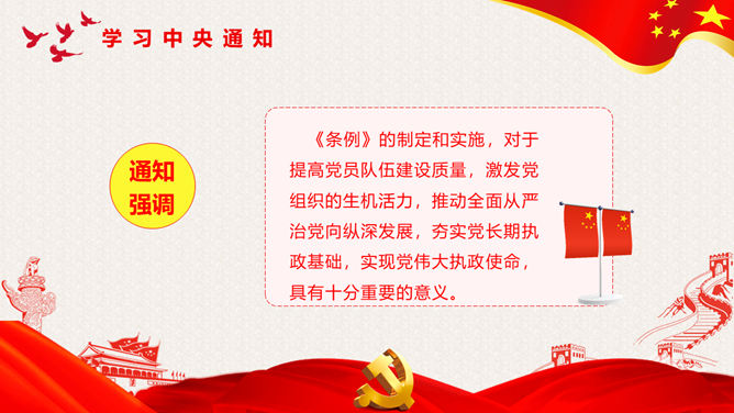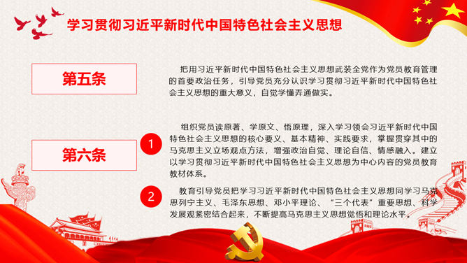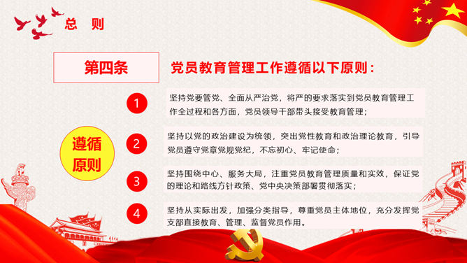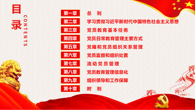 党员教育管理工作条例PPT模板。学习贯彻习近平新时代中国特色社会主义思想、党员教育基本任务、党员日常教育管理主要方式、党籍和党员组织关系管理、党员监督和组织处置、流动党员管理、党员教育管理信息化等。