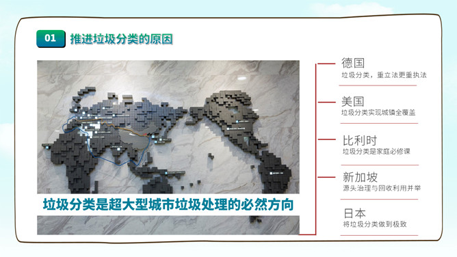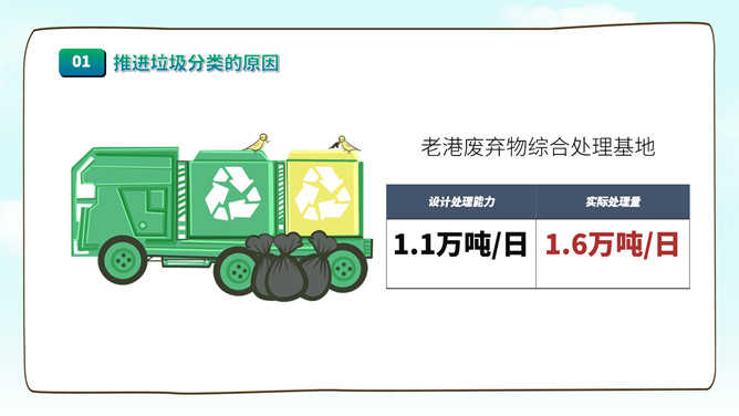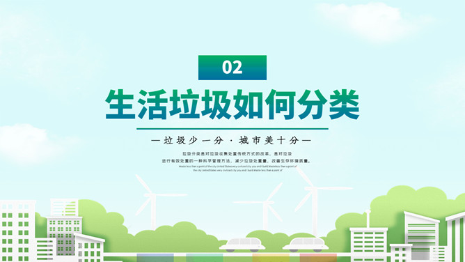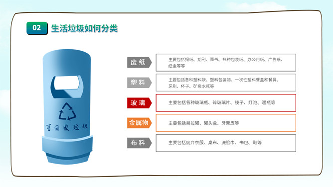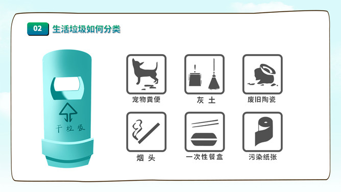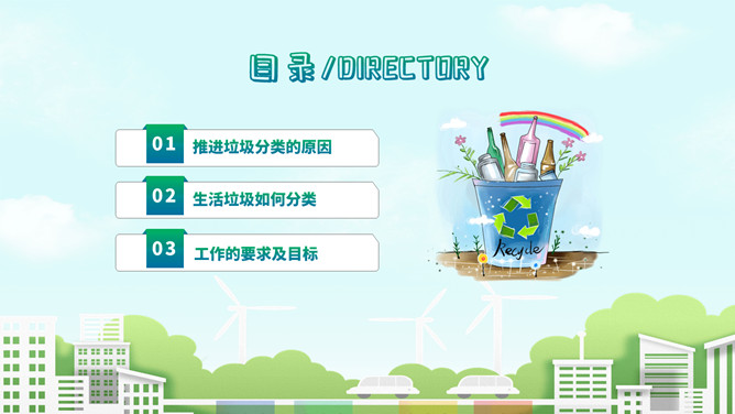 垃圾分类知识宣传PPT模板。一套垃圾分类知识介绍宣传幻灯片模板,圾分类的原因、垃圾如何分类、要求及目标。