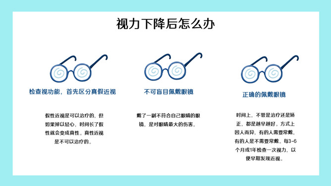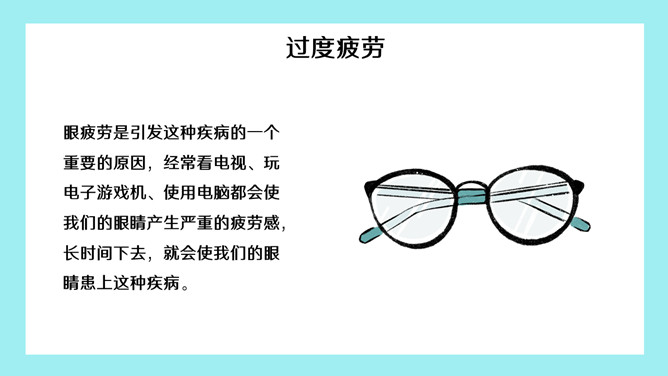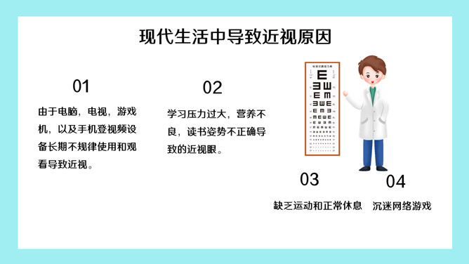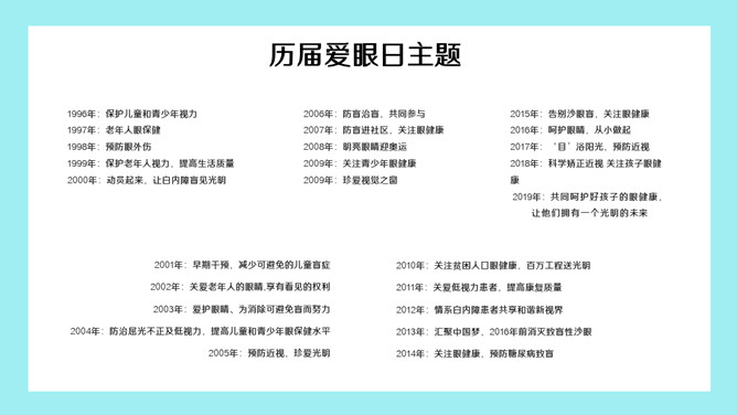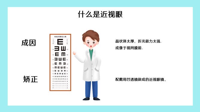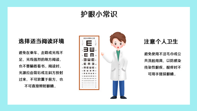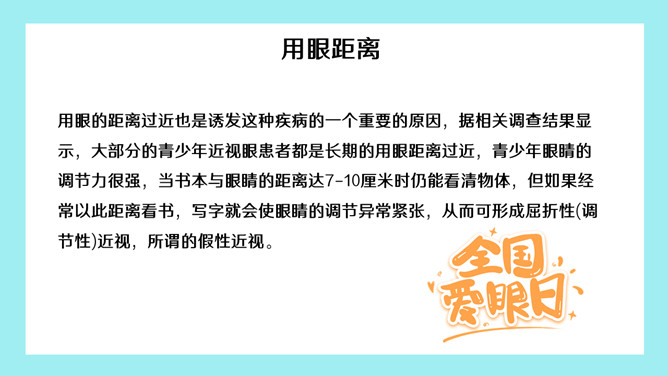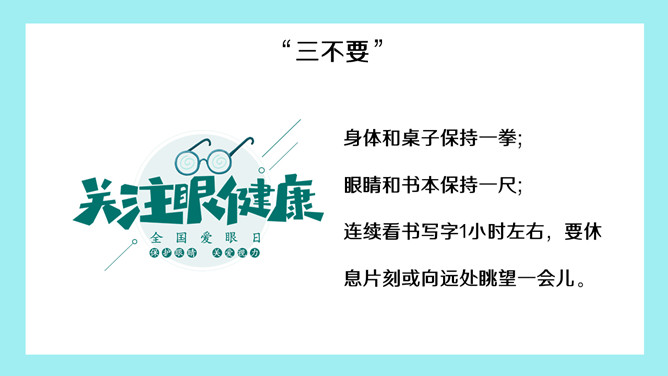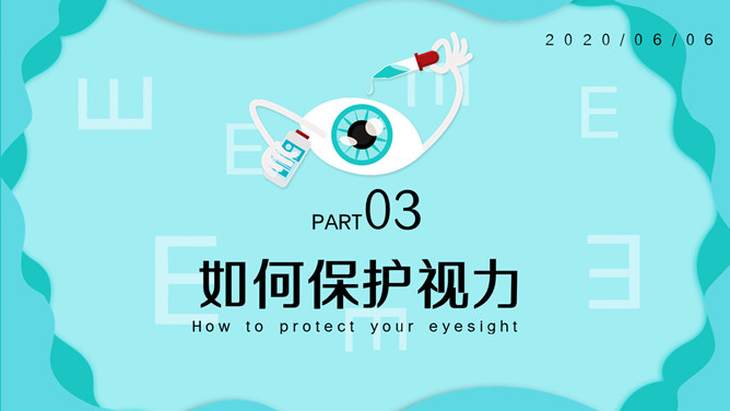 全国爱眼日宣传介绍PPT模板。全国爱眼日由来、中小学生近视原因、如何保护视力、护眼食品ABC。