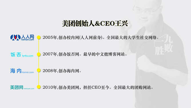 《九败一胜》读书笔记PPT。美团创始人&CEO王兴,100+亿美金堆出来的经验教训,到底他成功源于哪些因素?