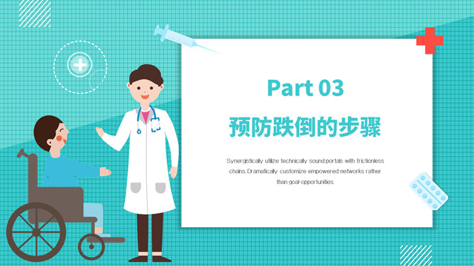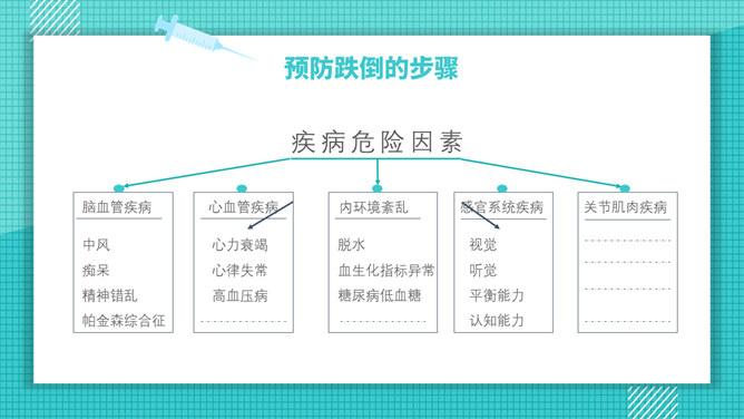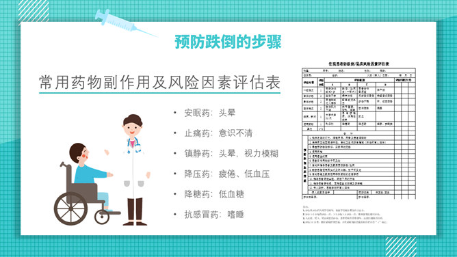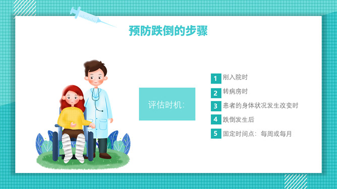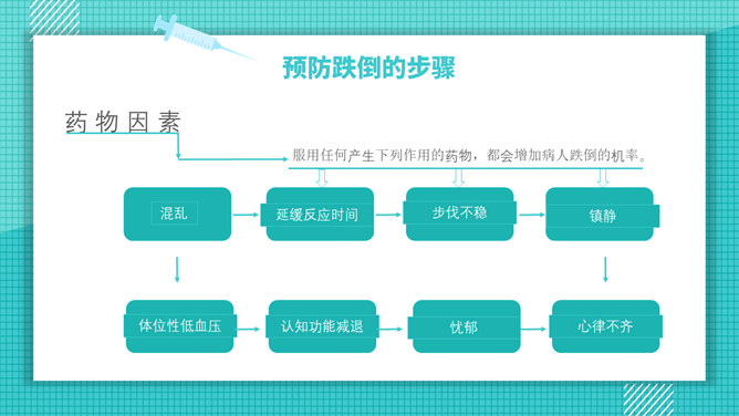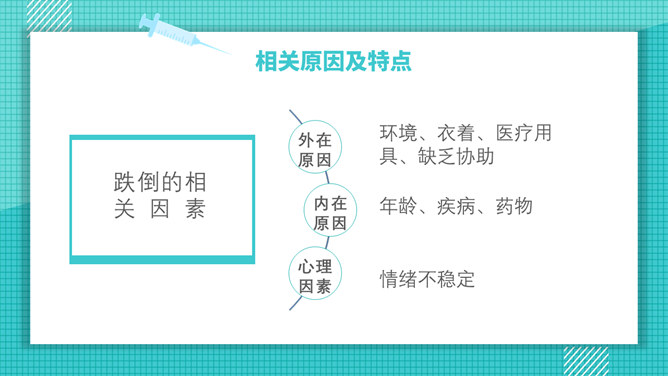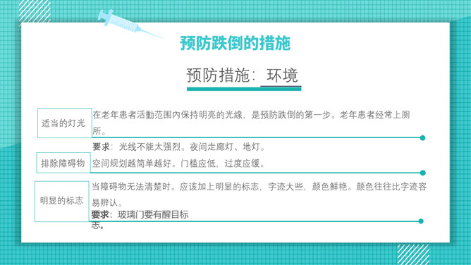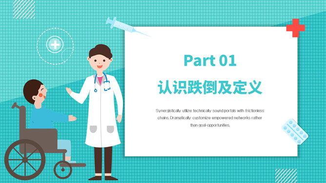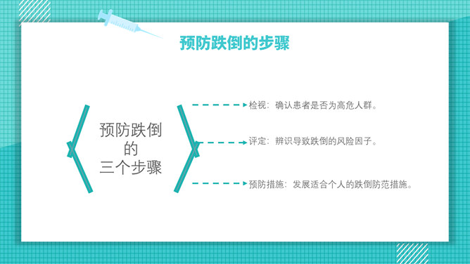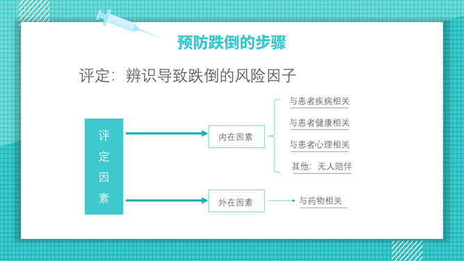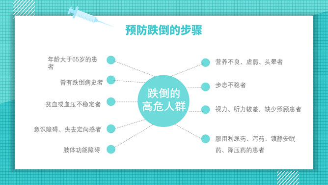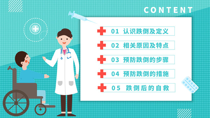跌倒的预防和护理PPT模板。认识跌倒及定义、相关原因及特点、预防跌倒的步骤和措施、跌倒后的自救。