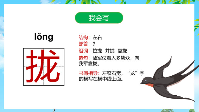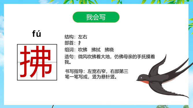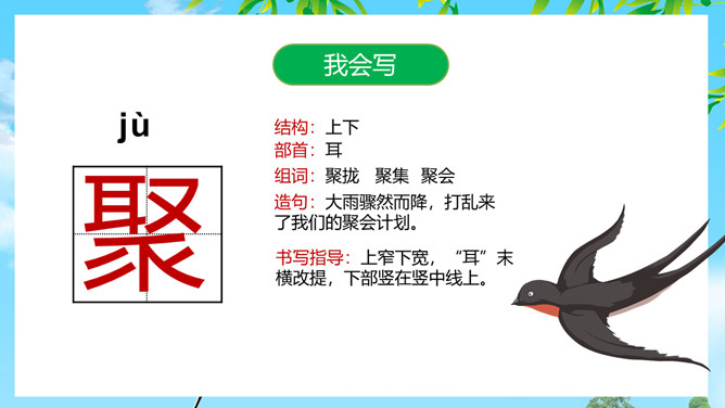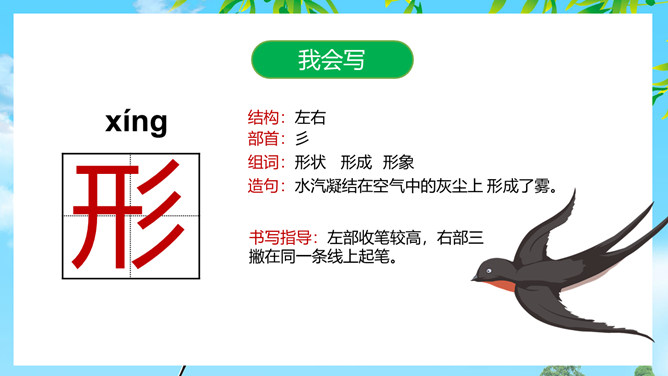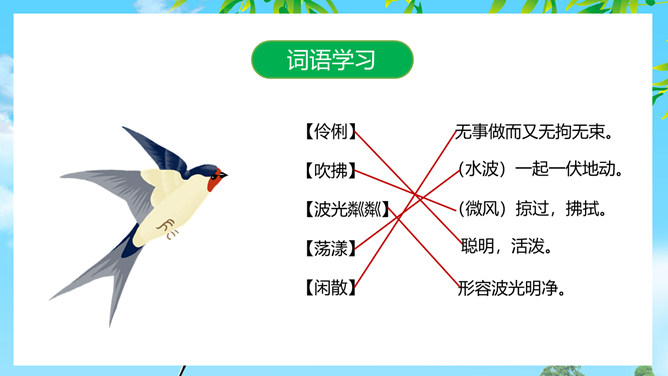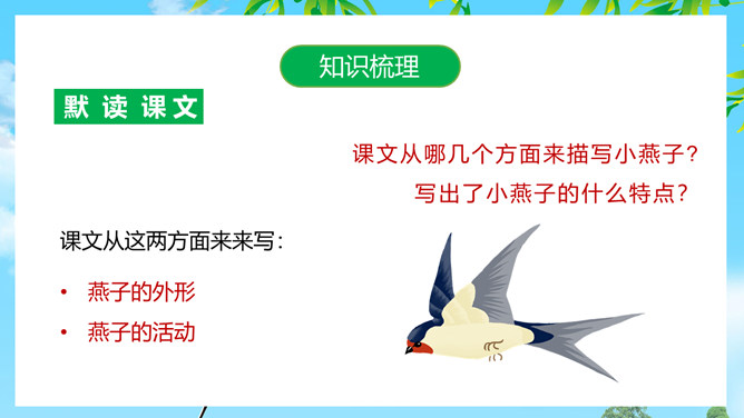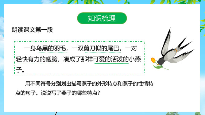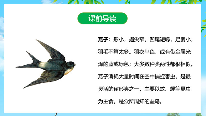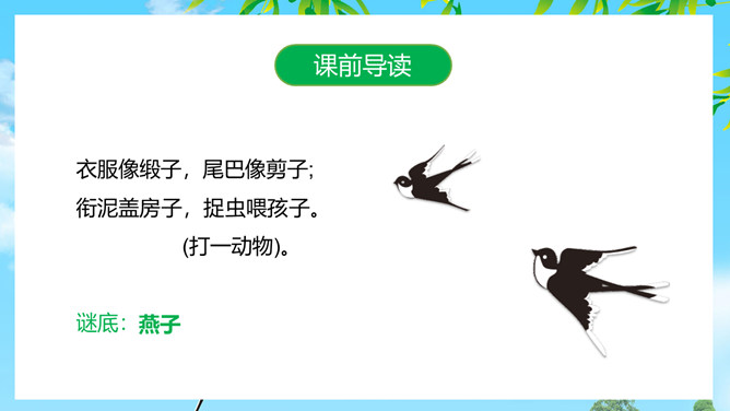 小燕子PPT课件1。衣服像缎子,尾巴像剪子;衔泥盖房子,捉虫喂孩子。(打一动物)。课文从哪几个方面来描写小燕子?写出了小燕子的什么特点?课文从这两方面来来写:燕子的外形。燕子的活动。用不同符号分别划出描写燕子的外形特点和燕子的性情特点的句子。说说写了燕子的哪些特点?