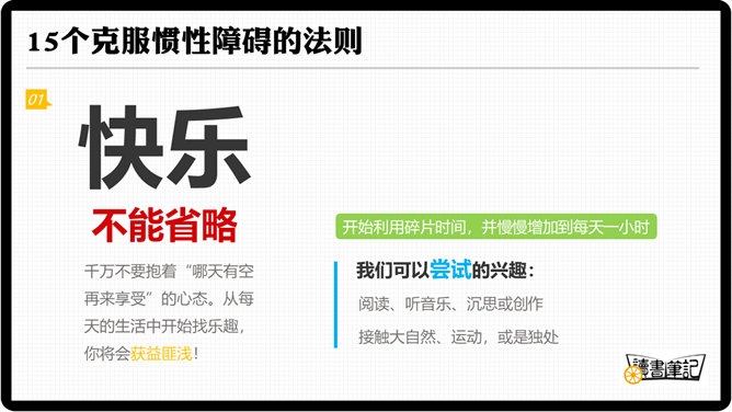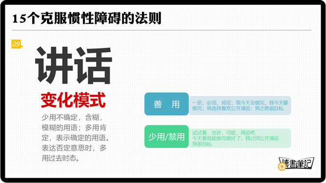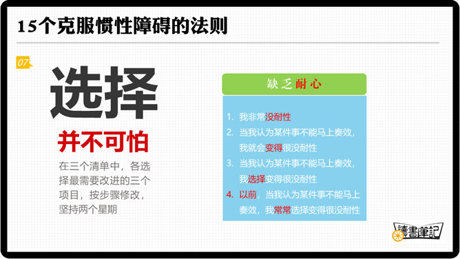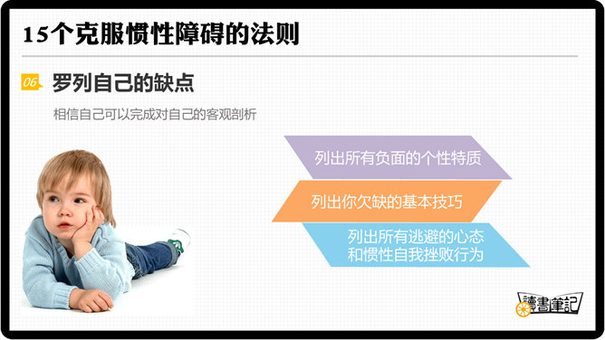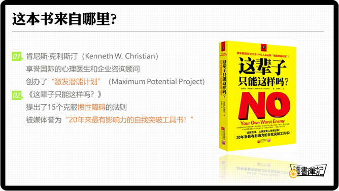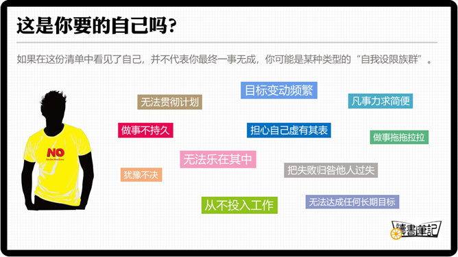 这辈子只能这样吗读书笔记PPT。如果在这份清单中看见了自己,并不代表你最终一事无成,你可能是某种类型的“自我设限族群”。无法贯彻计划、目标变动频繁、做事不持久、犹豫不决。