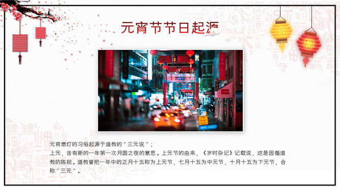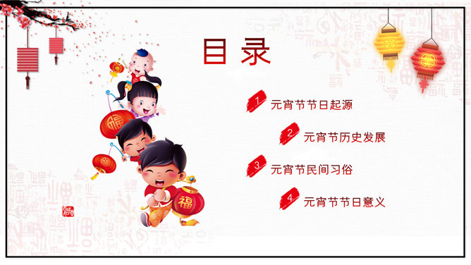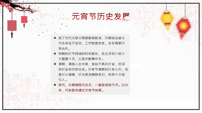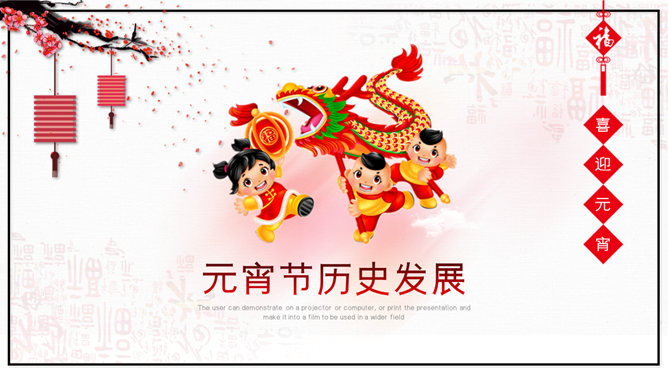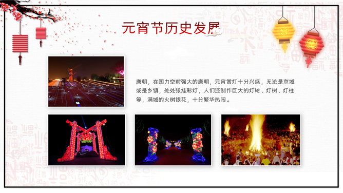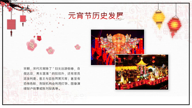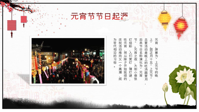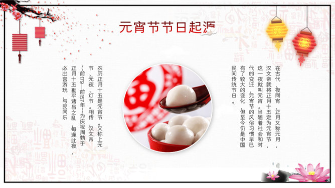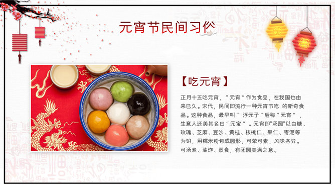 传统节日元宵节介绍PPT模板。一套喜庆元宵节主题幻灯片模板,红灯笼、元宵元素设计,介绍了元宵节相关文化传统。