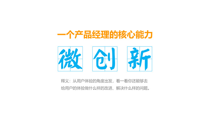 《如何成为优秀的产品经理》PPT读书笔记。打动用户的,绝不是什么高屋建瓴的宏论,而是回答用户一个问题:我给你解决了什么问题?一个产品经理的核心能力:微创新。