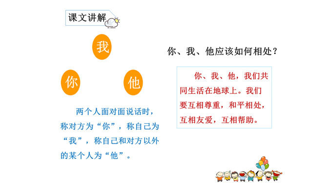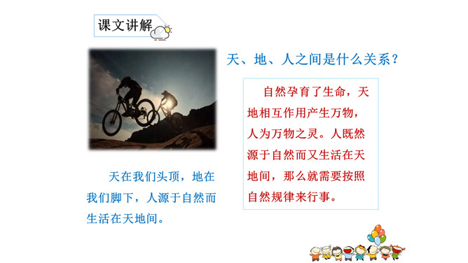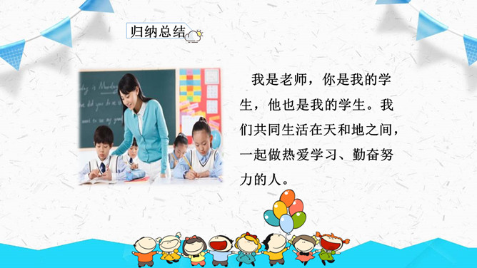 我是老师,你是我的学生,他也是我的学生。我们共同生活在天和地之间,一起做热爱学习、勤奋努力的人。两个人面对面说话时,称对方为“你”,称自己为“我”,称自己和对方以外的某个人为“他”。自然孕育了生命,天地相互作用产生万物,人为万物之灵。人既然源于自然而又生活在天地间,那么就需要按照自然规律来行事。所属专题:天地人ppt。