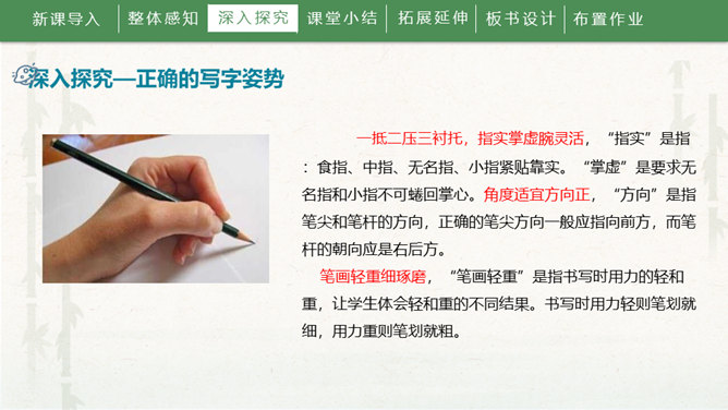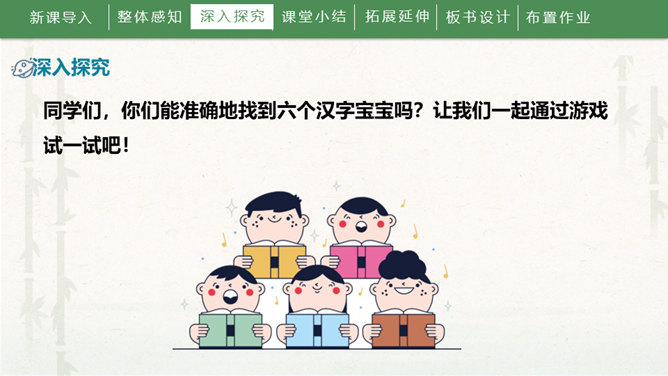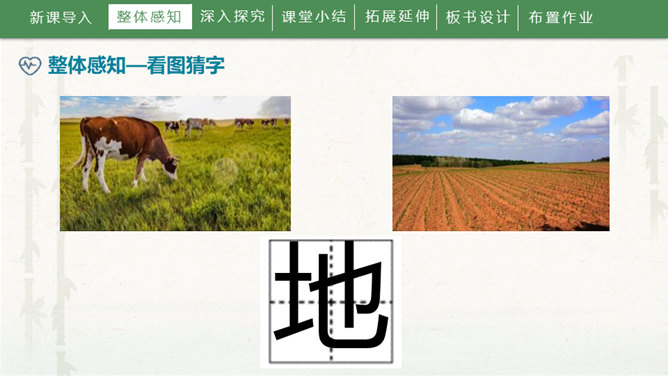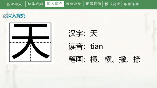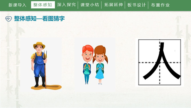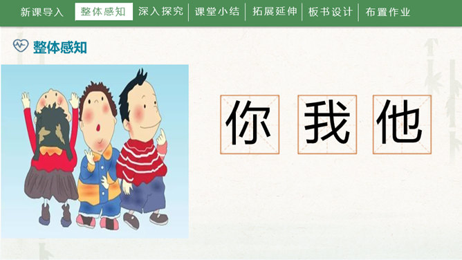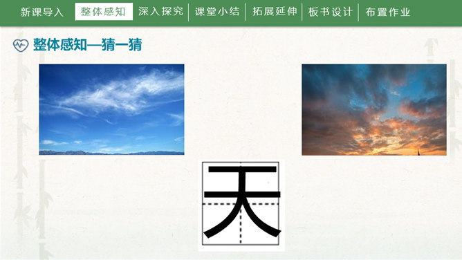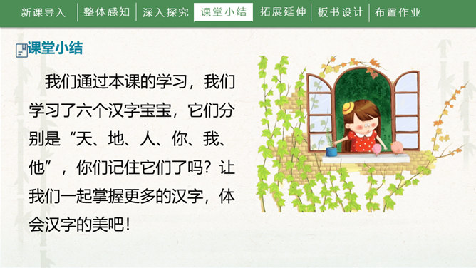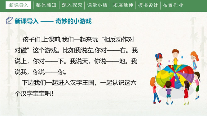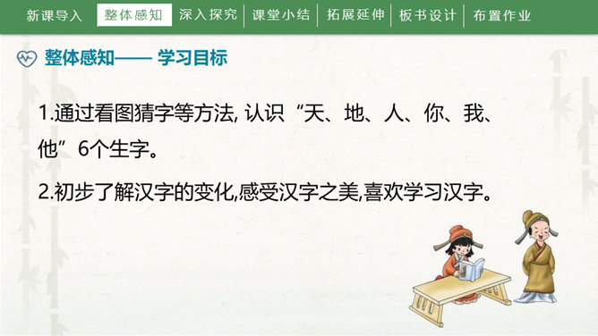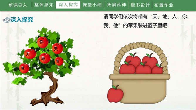 新课导入 —— 奇妙的小游戏:孩子们,上课前,我们一起来玩“相反动作对对碰”这个游戏。比如我说左,你对——右。我说上,你对——下。我说天,你说——地。我说我,你说——你。下边我们一起进入汉字王国,一起认识这六个汉字宝宝吧!整体感知—— 学习目标:1.通过看图猜字等方法, 认识“天、地、人、你、我、他”6个生字。2.初步了解汉字的变化,感受汉字之美,喜欢学习汉字。深入探究:同学们,你们能准确地找到六个汉字宝宝吗?让我们一起通过游戏试一试吧!请同学们依次将带有“天、地、人、你、我、他”的苹果装进篮子里吧!所属专题:天地人ppt。