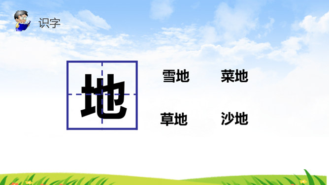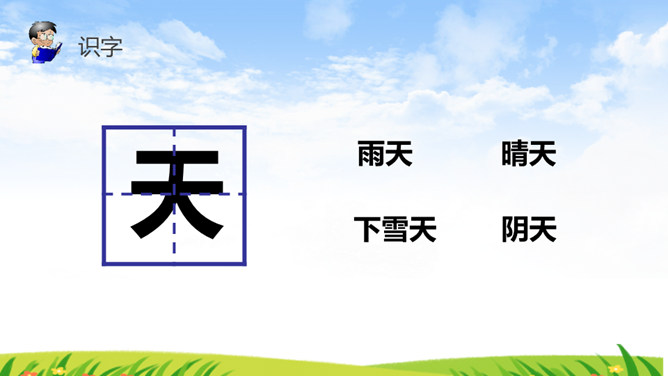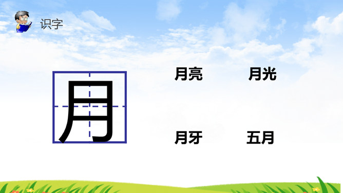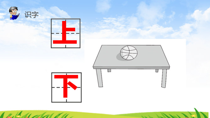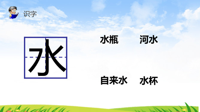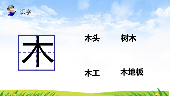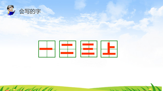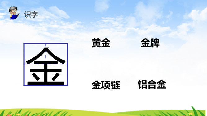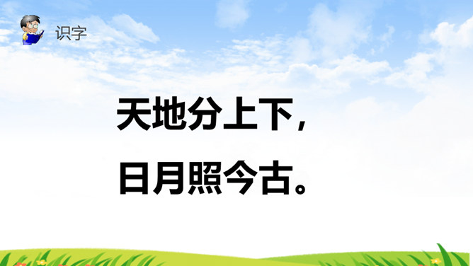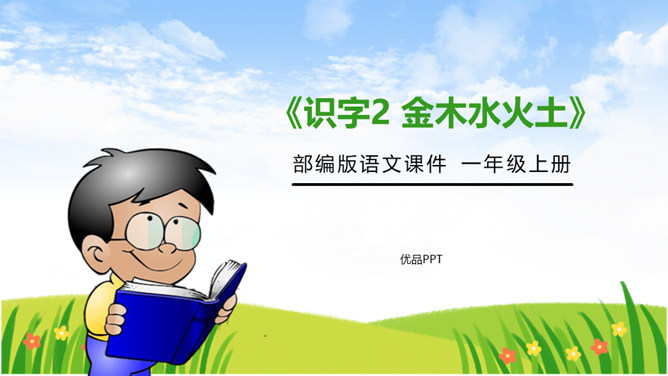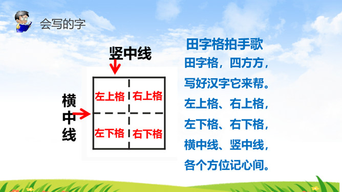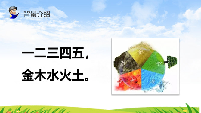 一二三四五,金木水火土。数一数:四只 五人 三朵。黄金 金牌 金项链 铝合金。木头 树木 木工 木地板。水瓶 河水 自来水 水杯。天地分上下,日月照今古。田字格拍手歌:田字格,四方方,写好汉字它来帮。左上格、右上格,左下格、右下格,横中线、竖中线,各个方位记心间。所属专题:金木水火土ppt。