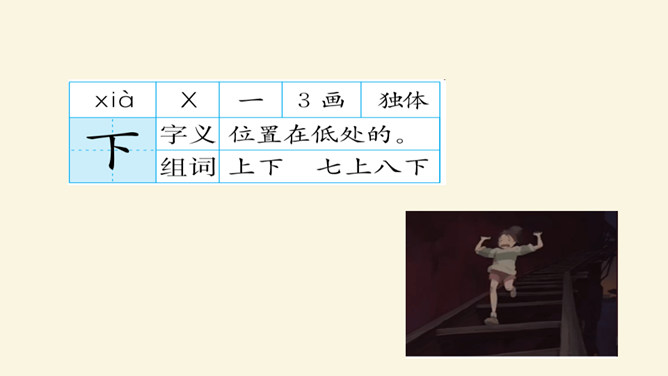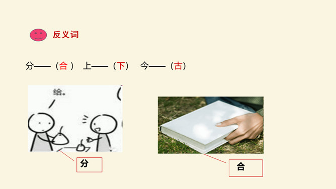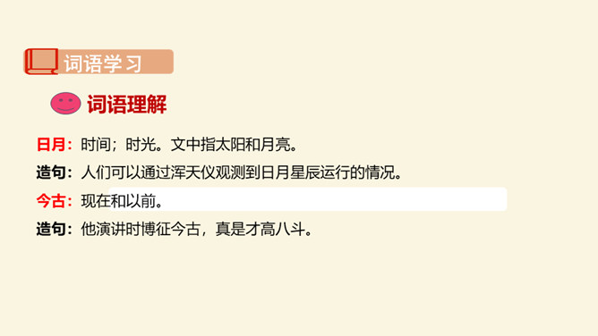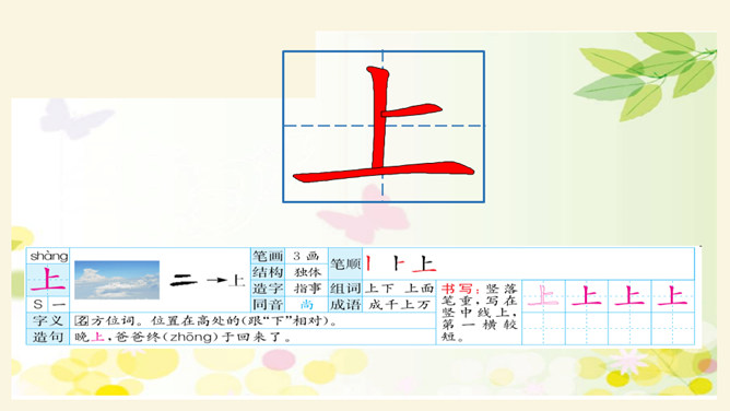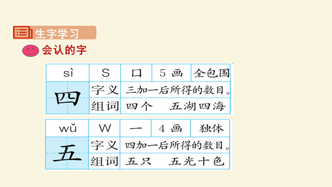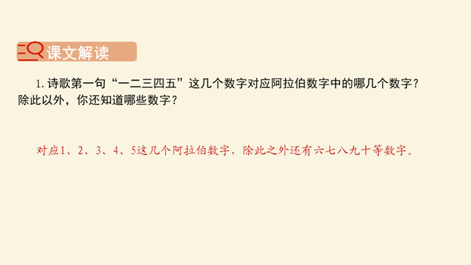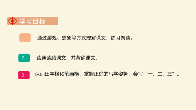 学习目标:通过游戏、想象等方式理解课文,练习朗读。 读通读顺课文,并背诵课文。认识田字格和笔画横,掌握正确的写字姿势,会写“一、二、三”。 词语理解:日月:时间;时光。文中指太阳和月亮。造句:人们可以通过浑天仪观测到日月星辰运行的情况。今古:现在和以前。造句:他演讲时博征今古,真是才高八斗。诗歌第一句“一二三四五”这几个数字对应阿拉伯数字中的哪几个数字?除此以外,你还知道哪些数字?所属专题:金木水火土ppt。
