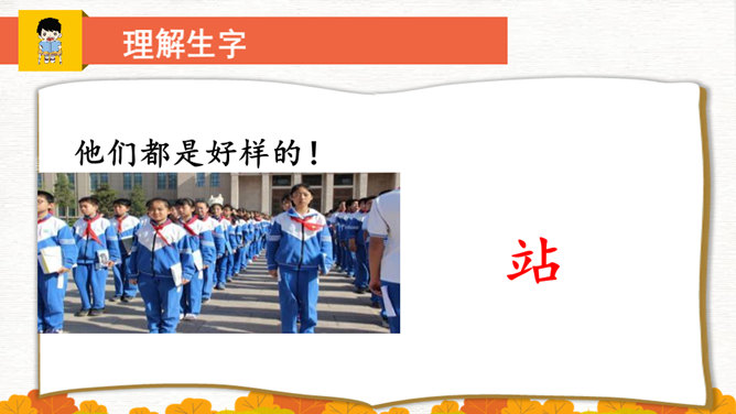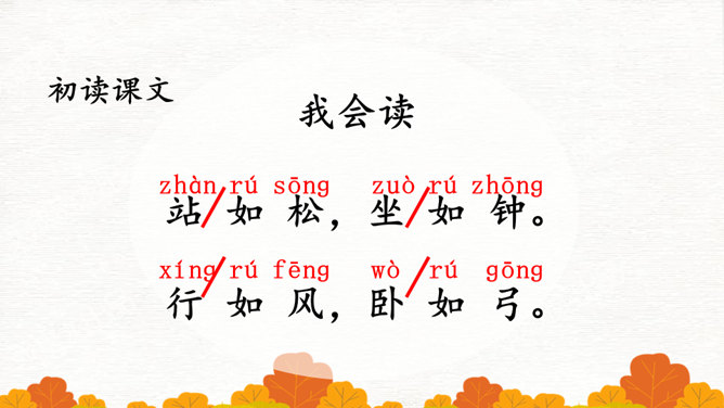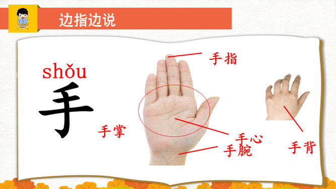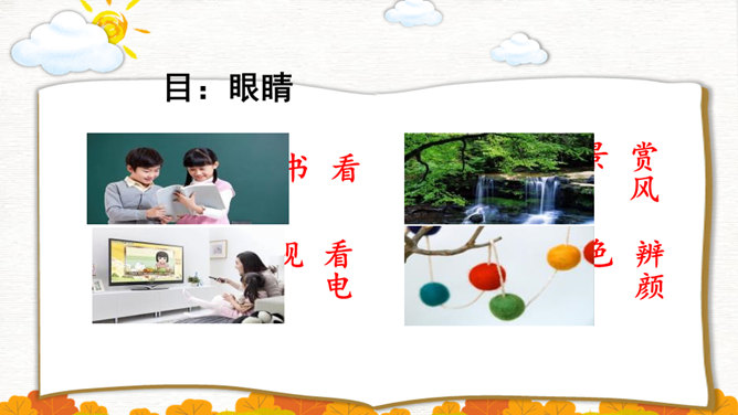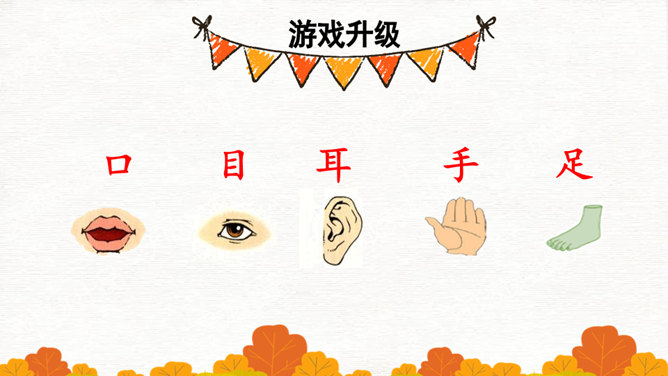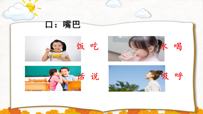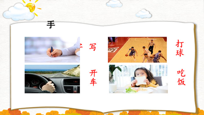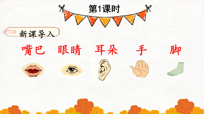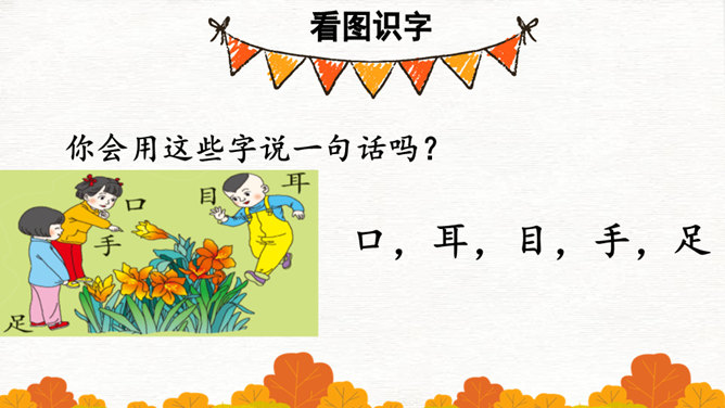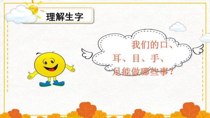 你会用这些字说一句话吗?我们的口、耳、目、手、足能做哪些事?同学们还记得上节课学习的《坐姿歌》吗?要时刻记得端正坐姿哦!同学们都见过哪些站立的情景呢?跟同学们分享一下吧!课后作业:1.调查体育活动课或体育比赛中,哪些运动项目主要靠手,哪些运动项目主要靠脚。2.想一想,我们在生活中用口、耳、目、手、足做了哪些事情。说一说,体育活动中,哪些主要靠手,哪些主要靠脚呢?所属专题:耳口目ppt。