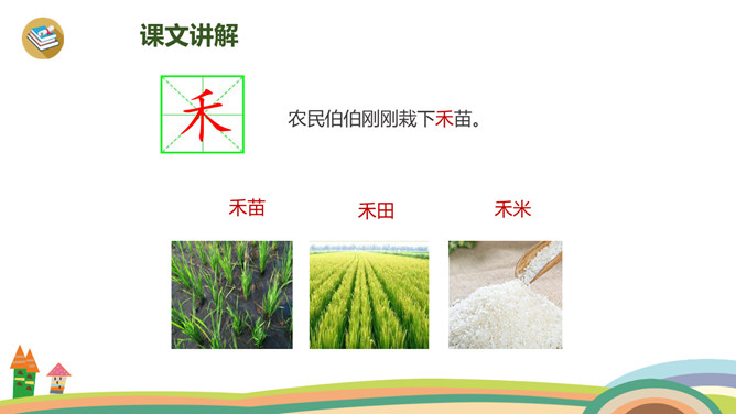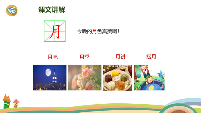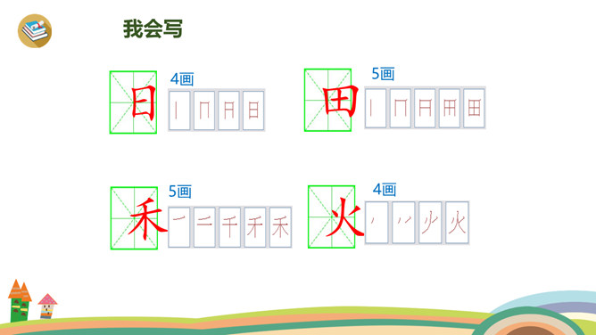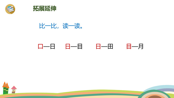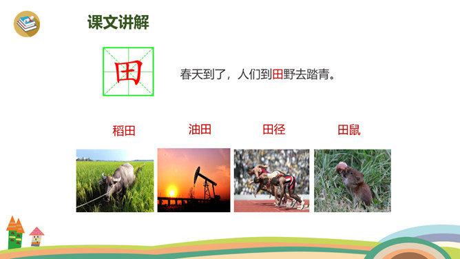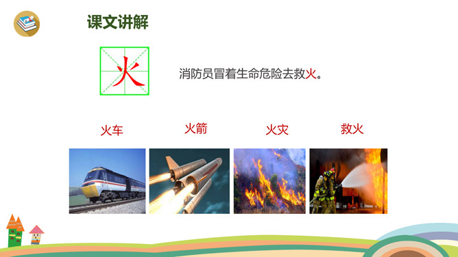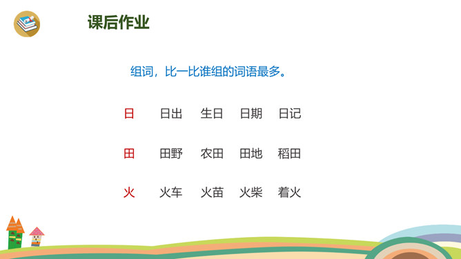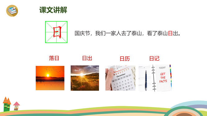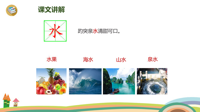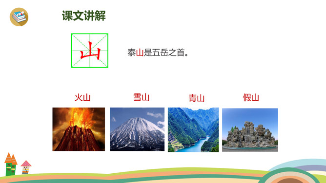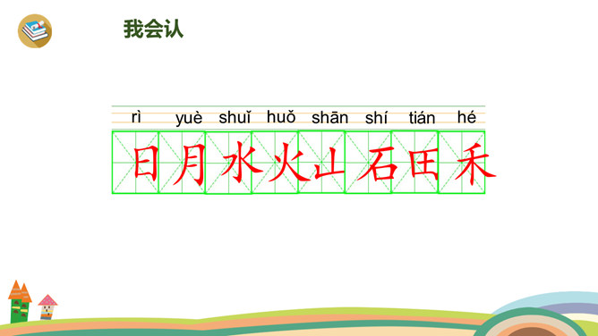 今天我们学习的生字都是象形字,这些字的形状和图片上的事物很像。这是不是很有趣呢!组词,比一比谁组的词语最多。比一比,读一读。 国庆节,我们一家人去了泰山,看了泰山日出。今晚的月色真美啊!趵突泉水清甜可口。消防员冒着生命危险去救火。泰山是五岳之首。山区的人们用石头盖房子。春天到了,人们到田野去踏青。农民伯伯刚刚栽下禾苗。所属专题:日月水火ppt。