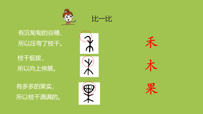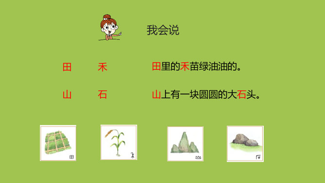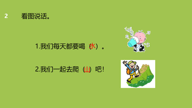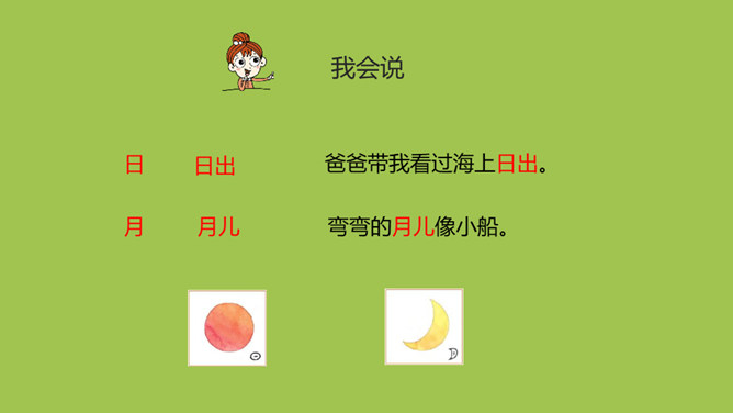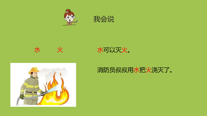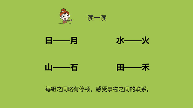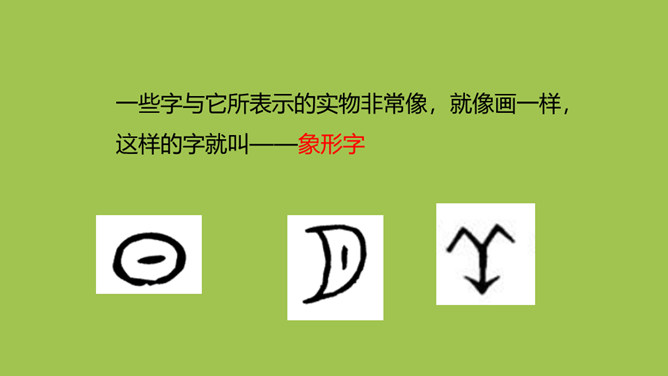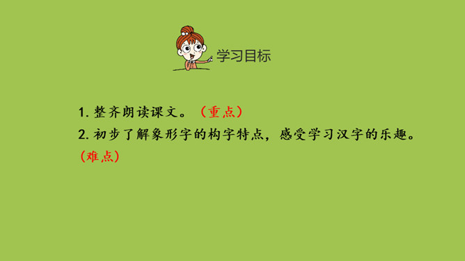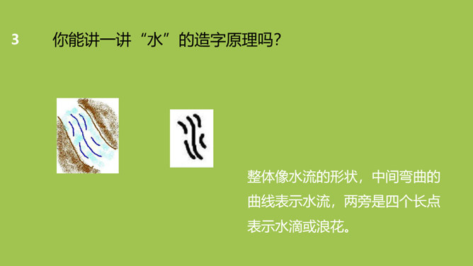 学习目标:1.整齐朗读课文。(重点)2.初步了解象形字的构字特点,感受学习汉字的乐趣。(难点)一些字与它所表示的实物非常像,就像画一样,这样的字就叫——象形字。通过学习,我们发现了象形字观物取象、以象示意的特点,也感受到了造字的无穷乐趣。读一读,比一比,看看谁读得又快又准。你能讲一讲“水”的造字原理吗?整体像水流的形状,中间弯曲的曲线表示水流,两旁是四个长点表示水滴或浪花。所属专题:日月水火ppt。